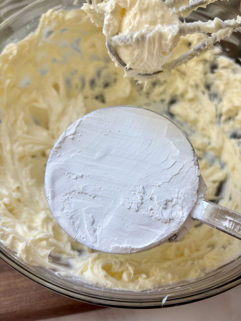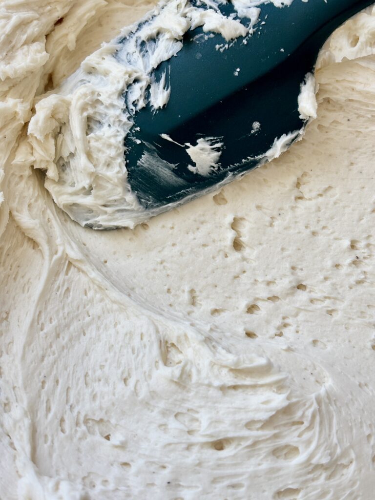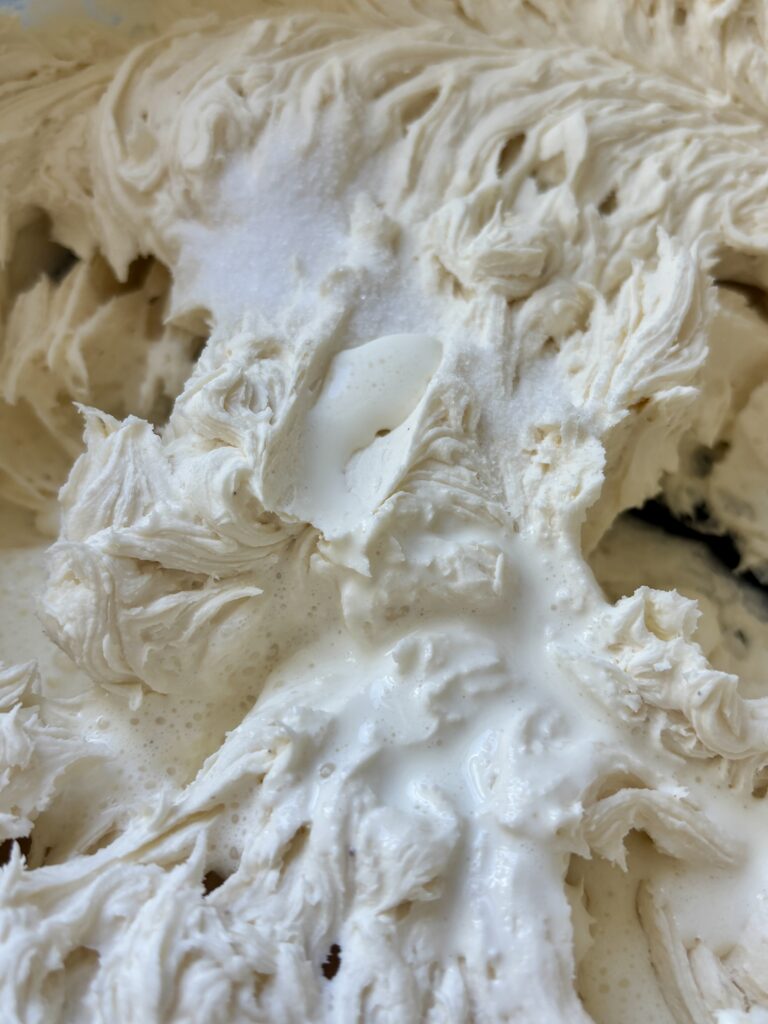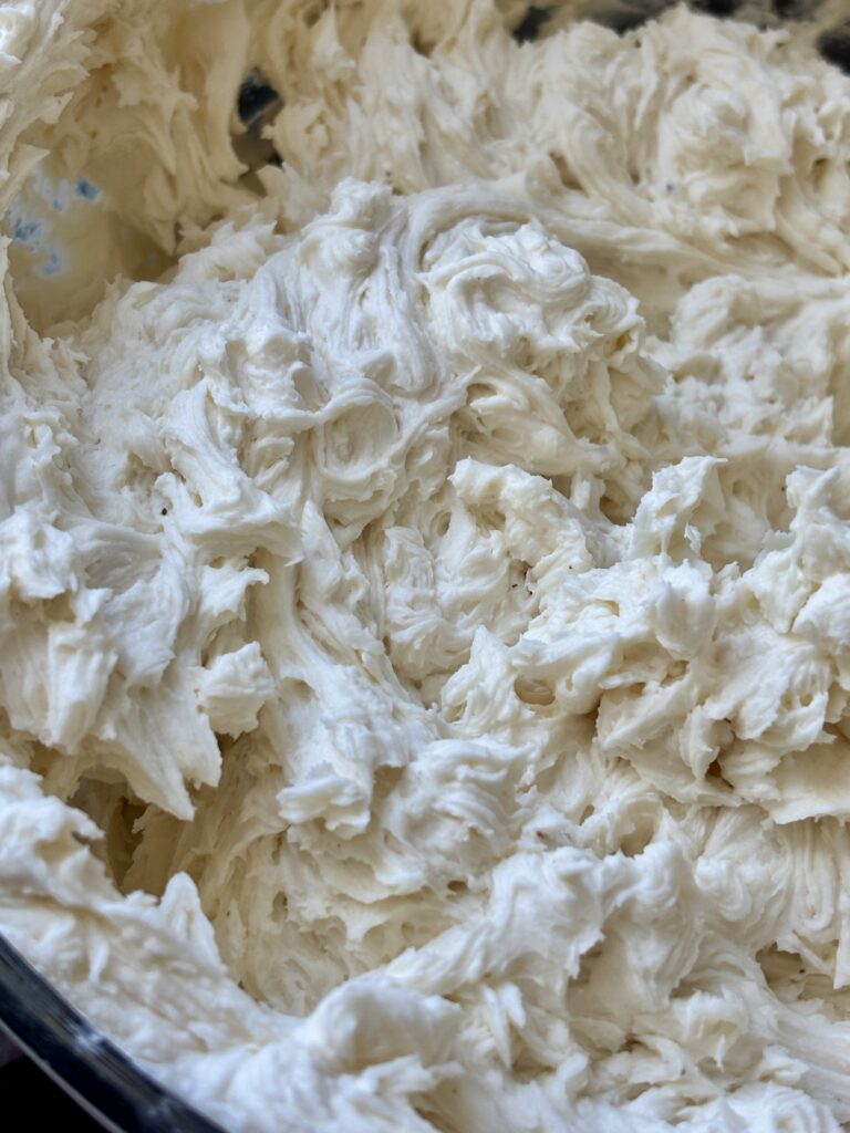 - Beat your butter on medium-high speed for 3–4 minutes until it’s very pale, fluffy, and smooth. This incorporates air, giving the frosting that light bakery-style texture.