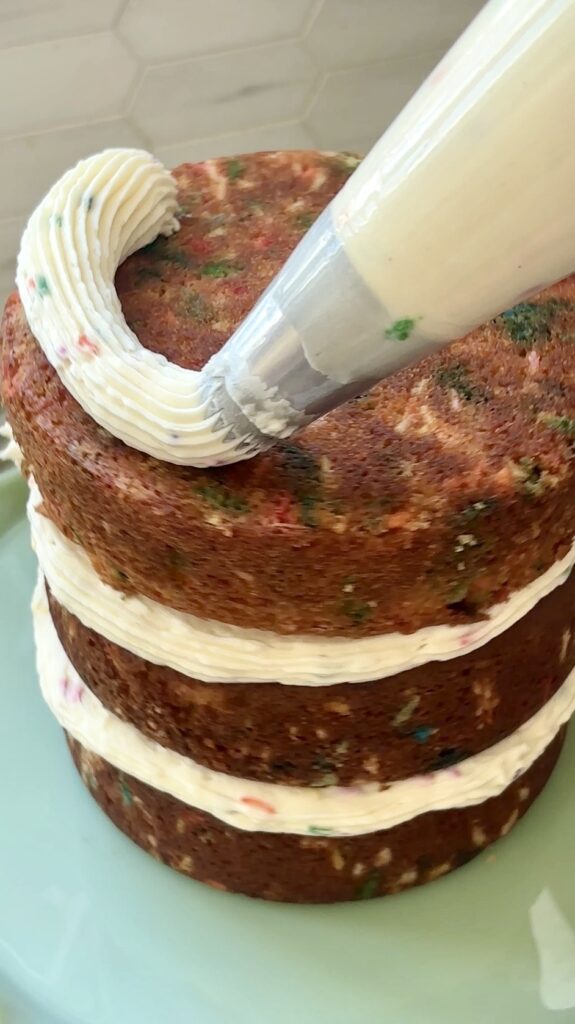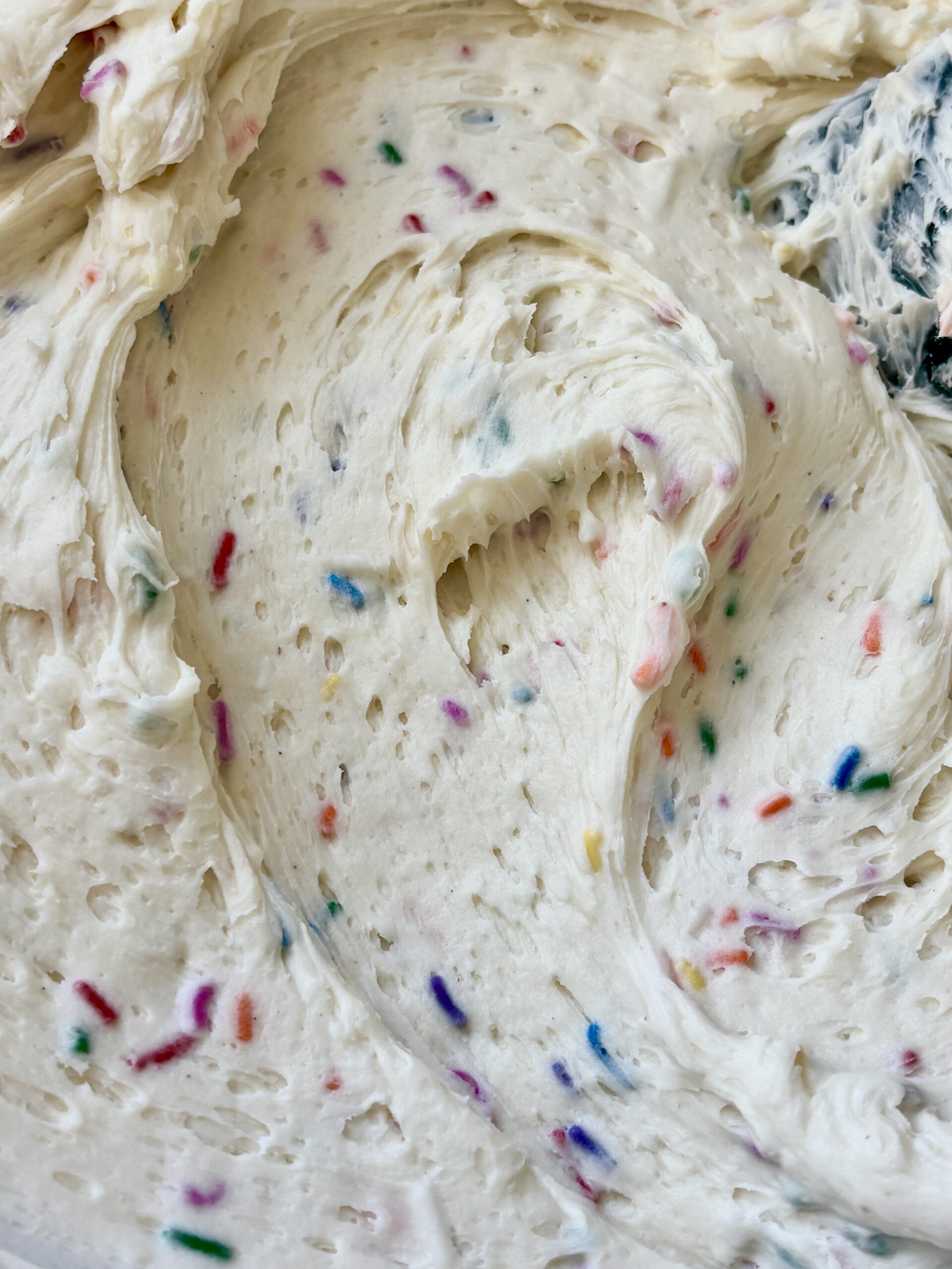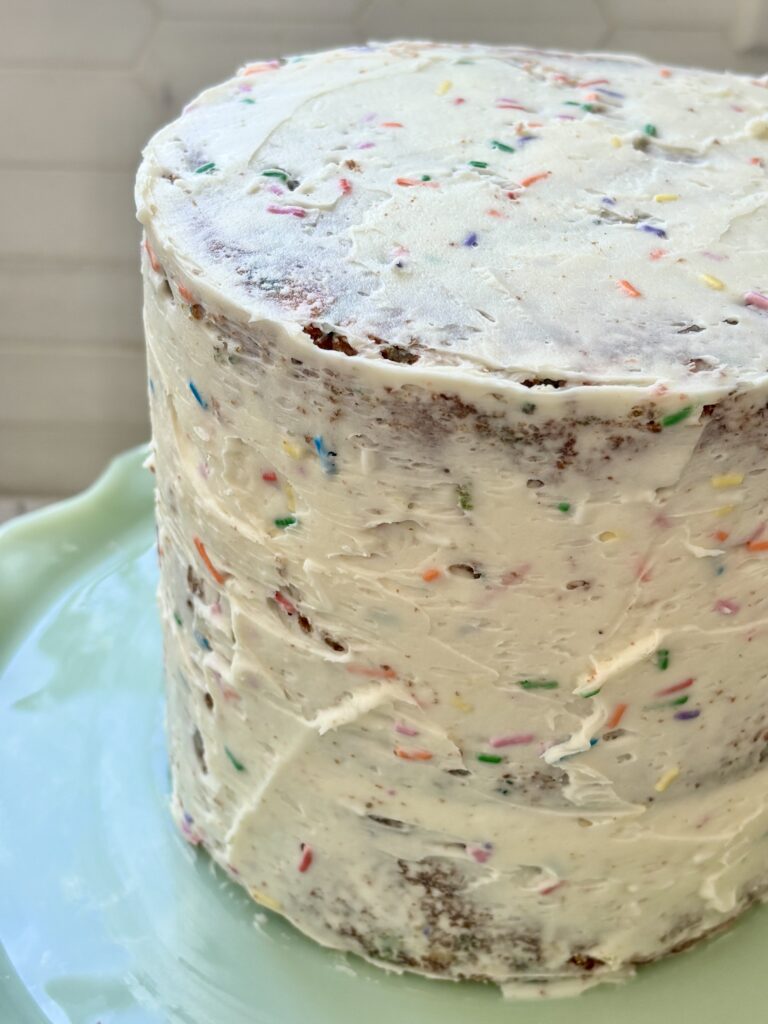 Rainbow sprinkles or bake stable sprinkles are ideal. They maintain vibrant colors and don’t melt into the frosting, keeping a beautiful speckled appearance.