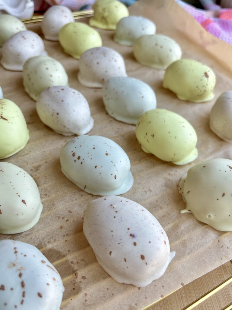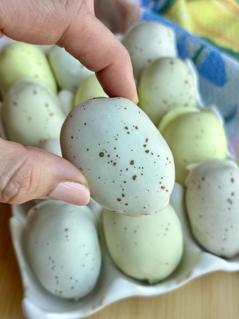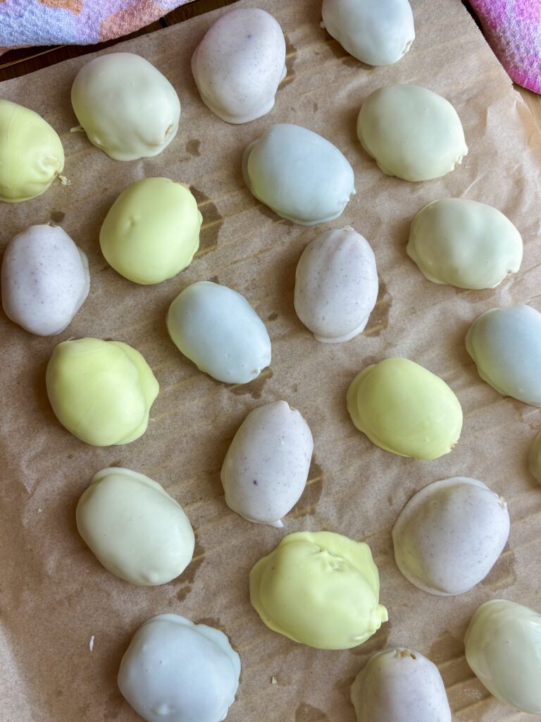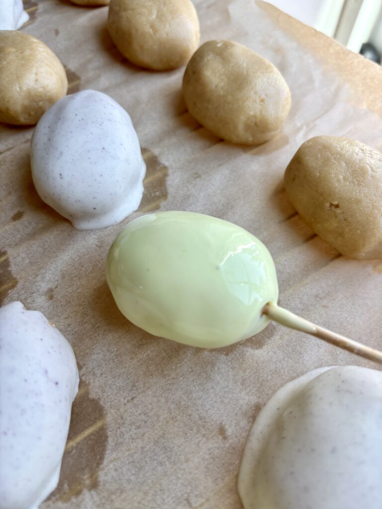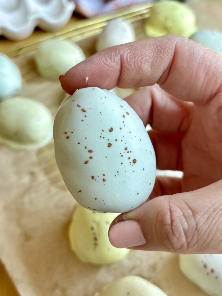 - Chill the eggs before dipping so the eggs hold their shape better. I usually stick them in the freezer for 20 minutes as I prepare the chocolate. If doing this over 2 days, you can make the eggs and place them in the refrigerator overnight.