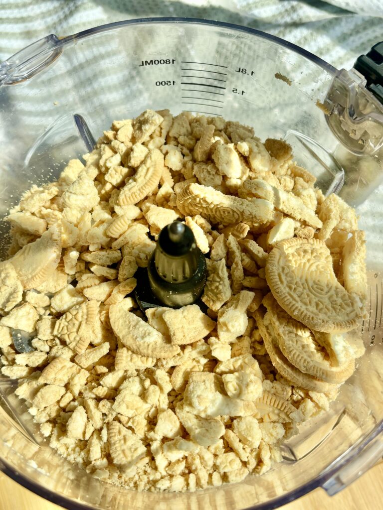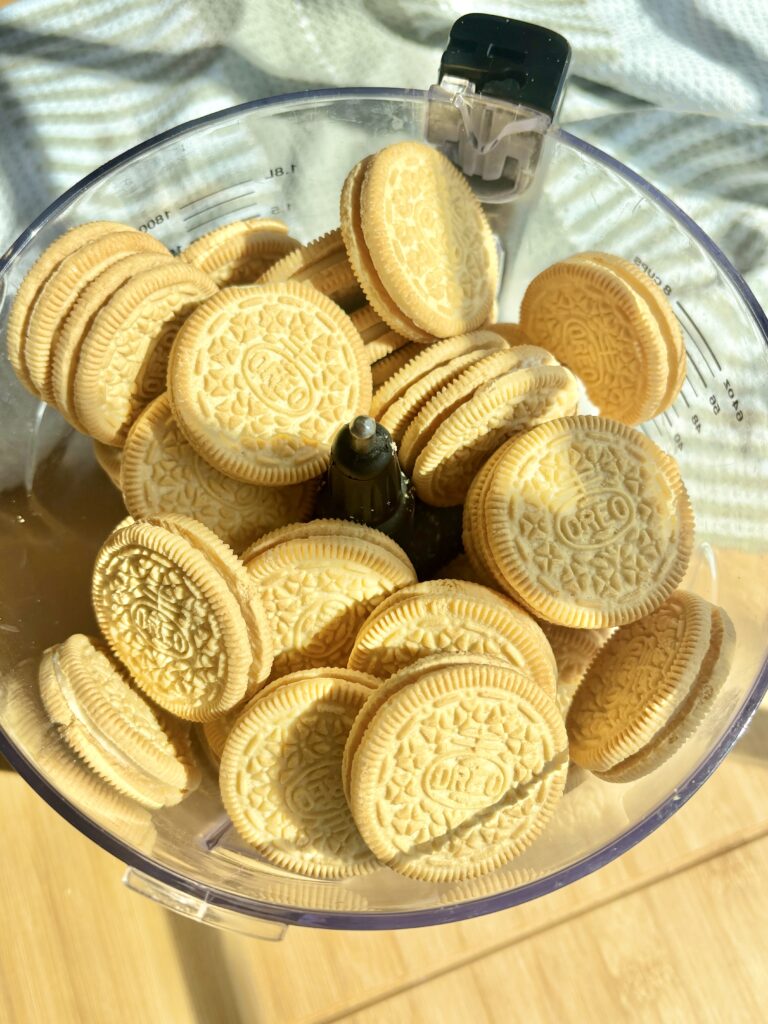 - Add Golden Oreos to a food processor, briefly pulse to break up the oreos a little.