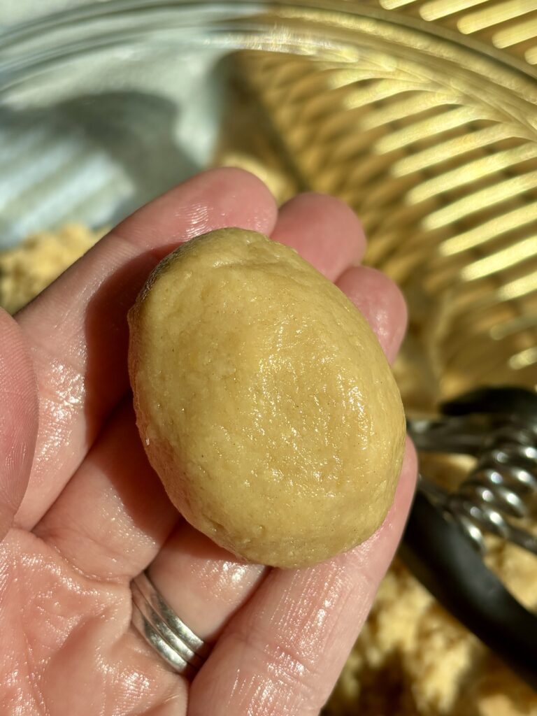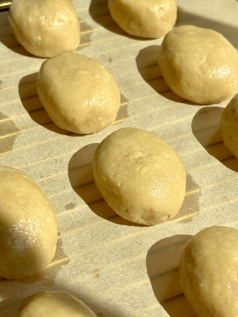 - Scoop mixture and form into egg shapes. Place on a lined baking sheet.