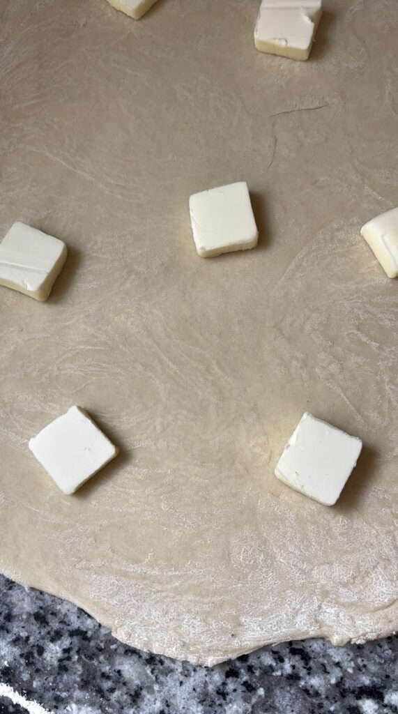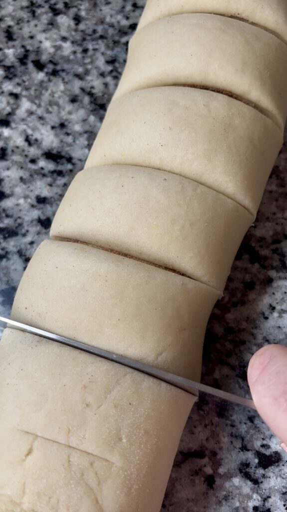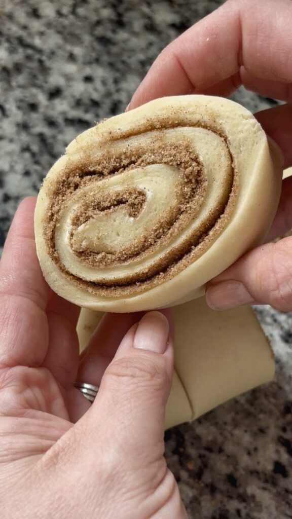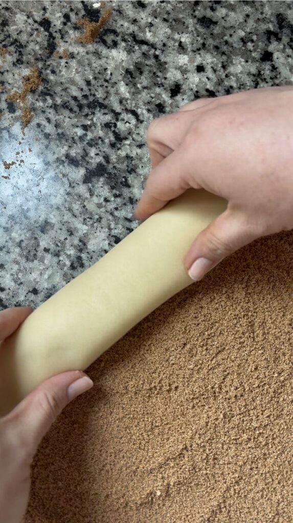 • Lightly flour a work surface and turn out the dough. Roll gently into a 12×17” rectangle. Spread with 6 tbsp of softened butter and then sprinkle on cinnamon sugar. Roll dough up starting at the long end.