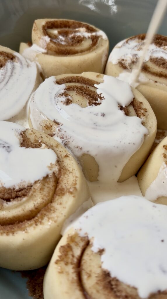 • Heavy Cream: Poured over the rolls before baking for ultra-soft, gooey centers and a rich texture.