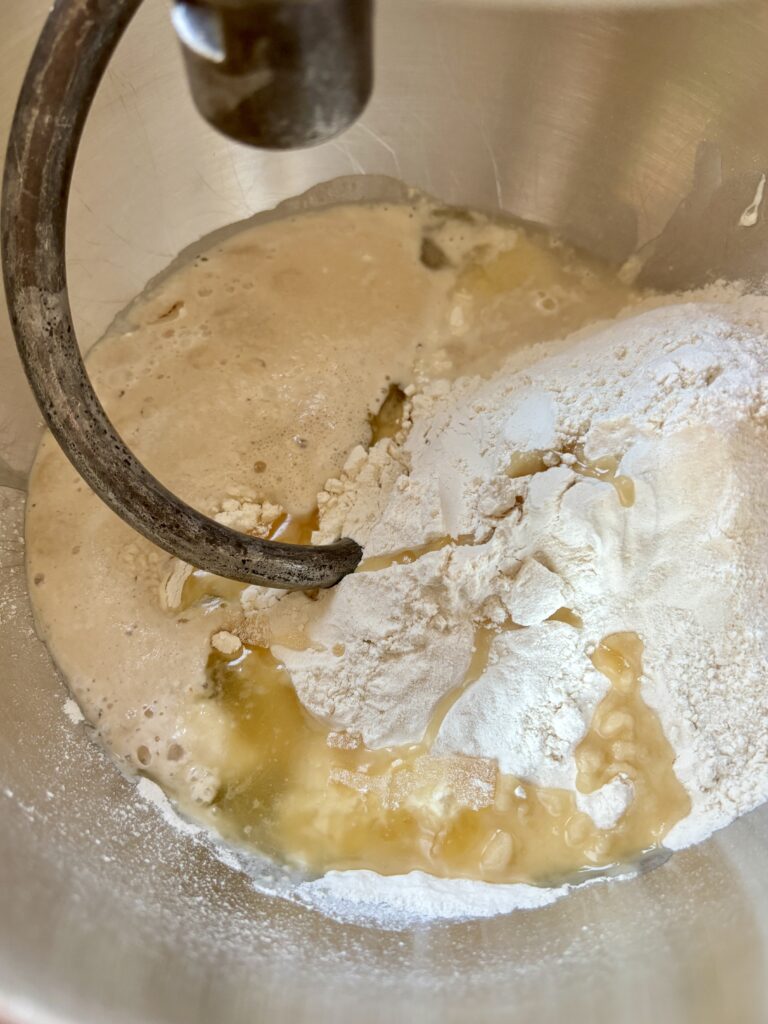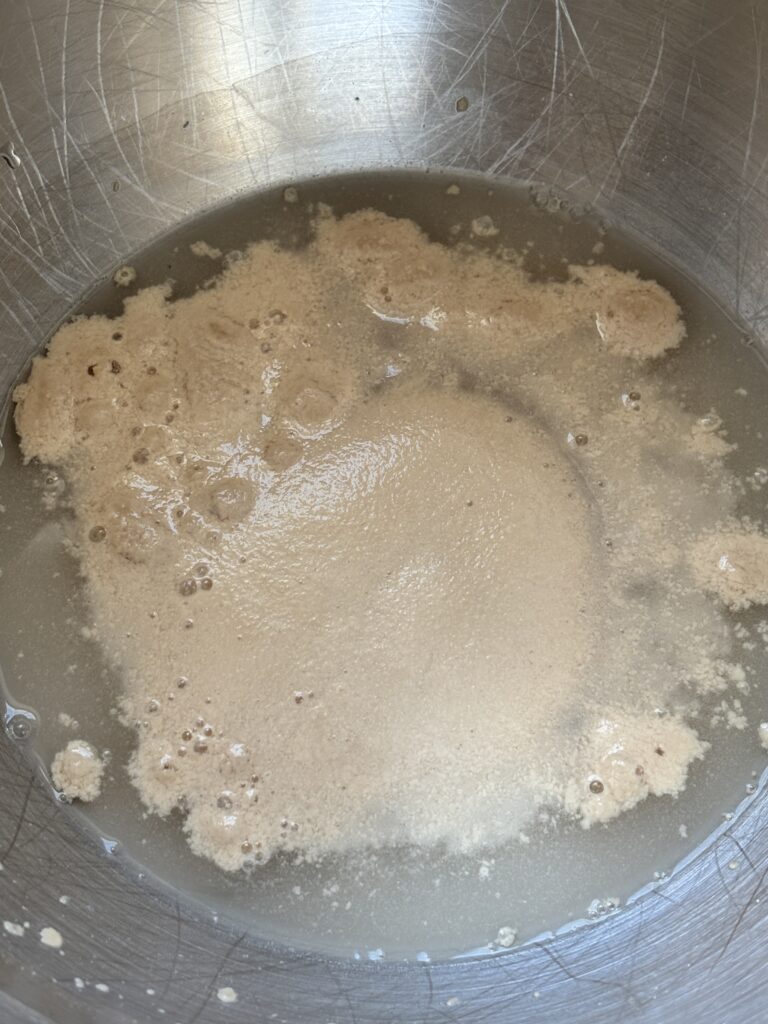 • In a large bowl, mix warm water, honey, sugar, and yeast. Let sit 5–10 minutes until foamy (you can skip resting time if using instant yeast).