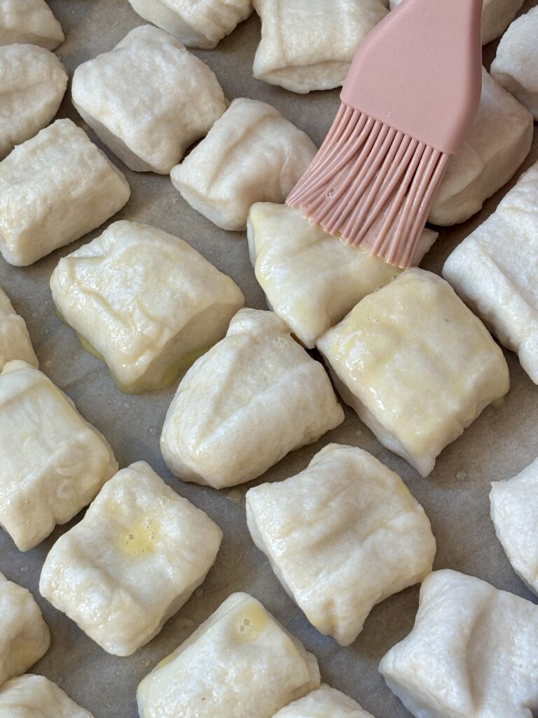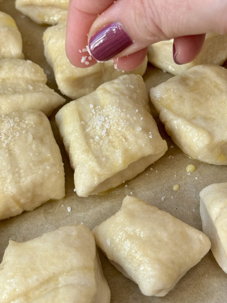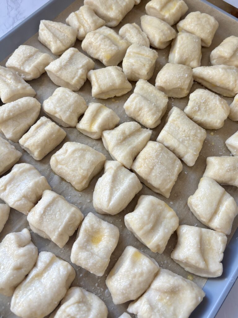• Place shaped dough on parchment lined baking sheets and let rest uncovered for 10–15 minutes.