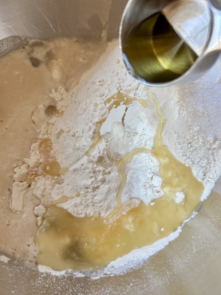 • Add olive oil, salt, and bread flour. Mix until a shaggy dough forms, then knead for 7–9 minutes until smooth, elastic, and slightly tacky.