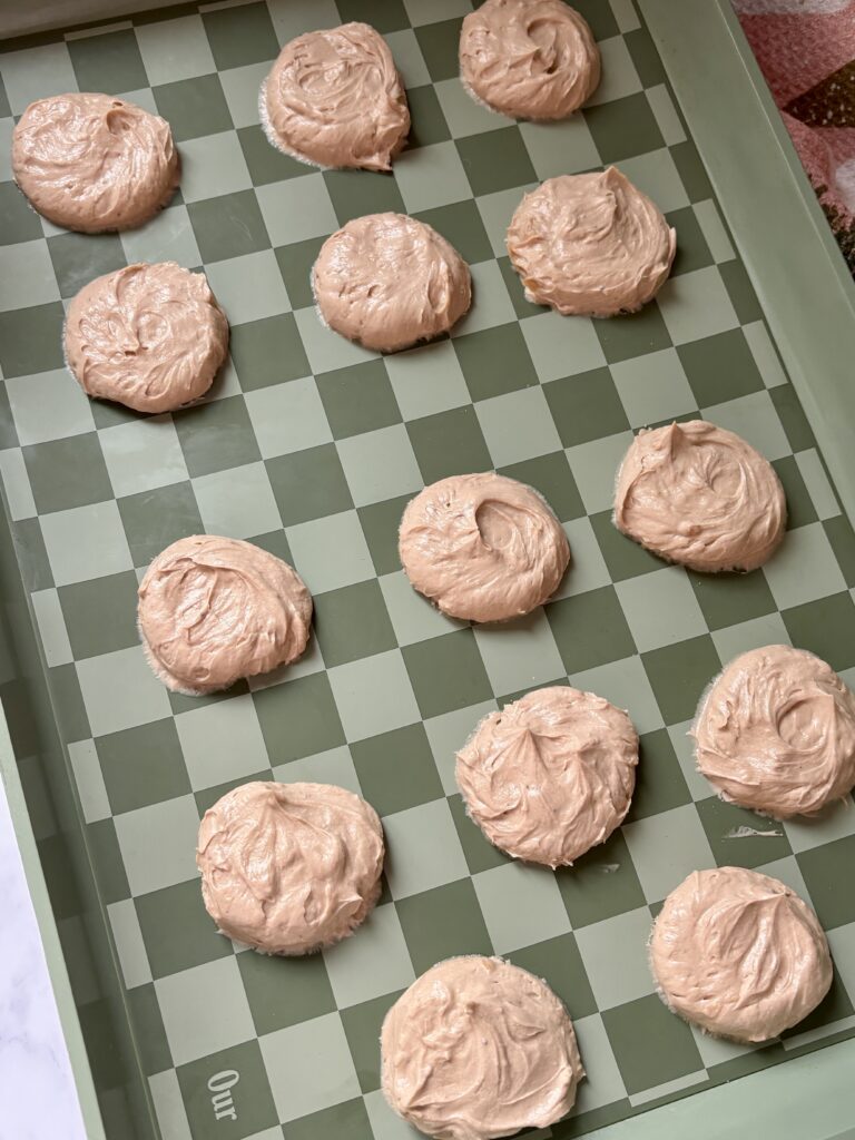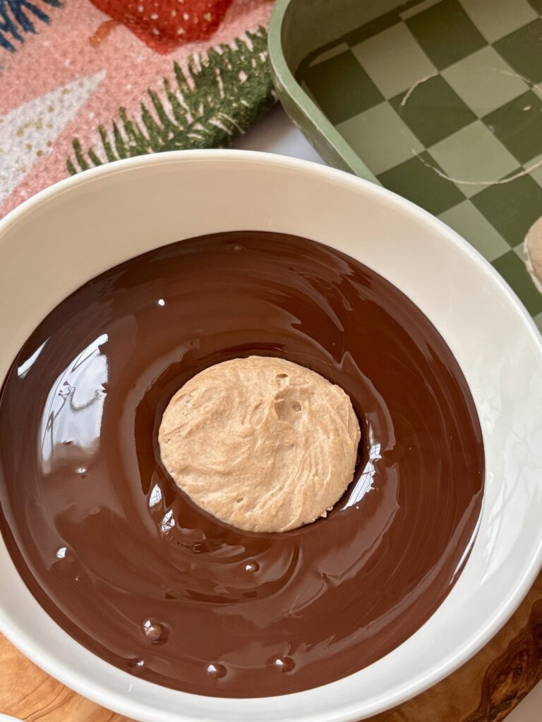 • Remove from freezer and dip each disc completely in melted chocolate. Place back on parchment paper.