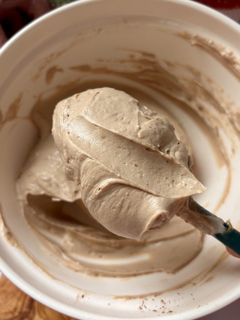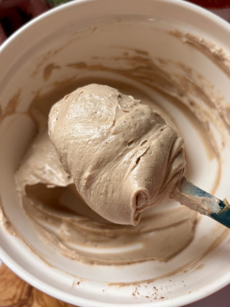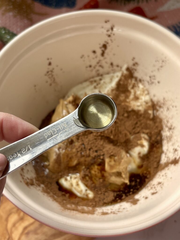 • In a medium bowl, mix together Greek yogurt, cashew butter, honey, vanilla bean paste, cocoa powder, cinnamon, and butter extract until fully combined.