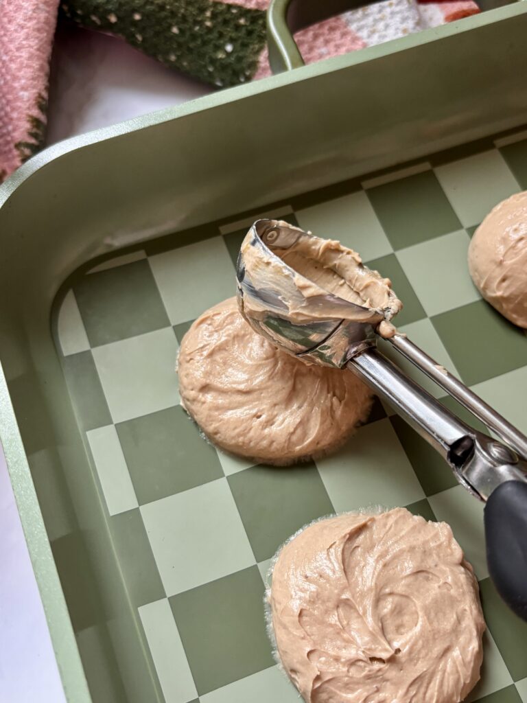 • Spoon 1 1/2 tablespoon portions onto a parchment-lined baking sheet. Flatten each into a disc shape (makes 12-14).