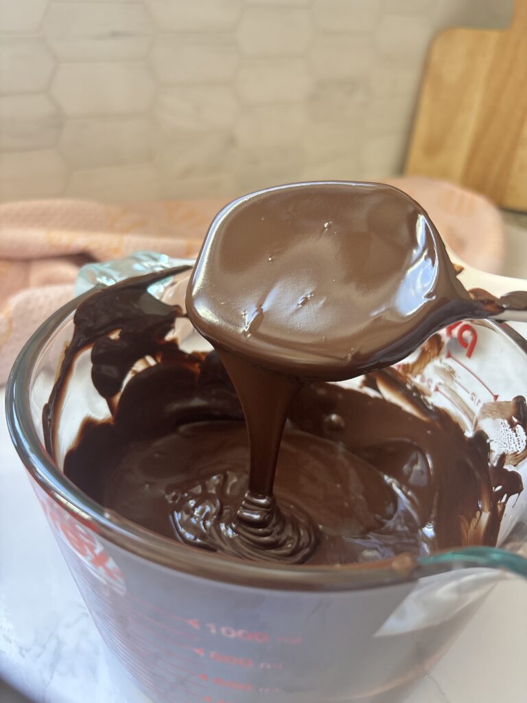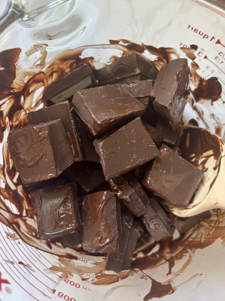 3. Add chopped chocolate to the heatproof bowl on top and stir constantly as it melts from the steam’s heat.