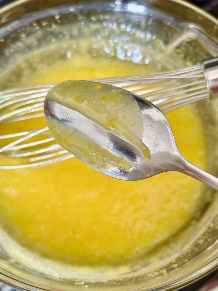 • Cook over medium-low heat, whisking constantly, for 8–12 minutes until curd thickens enough to coat the back of a spoon, or reaches 170–175°F.