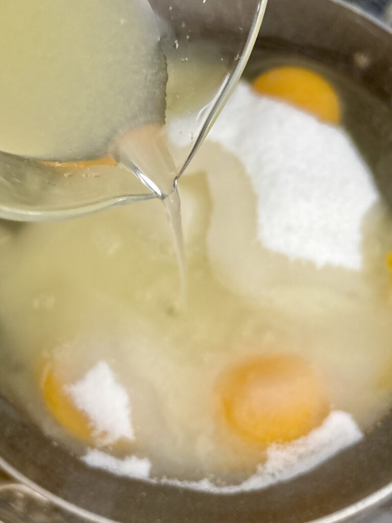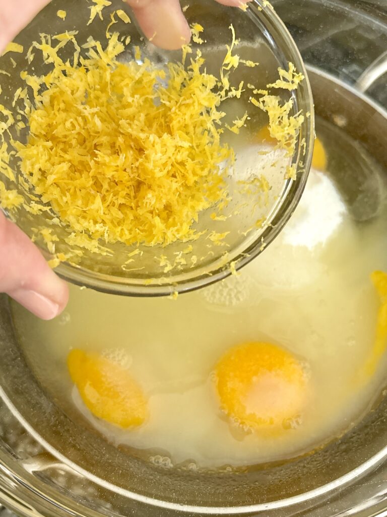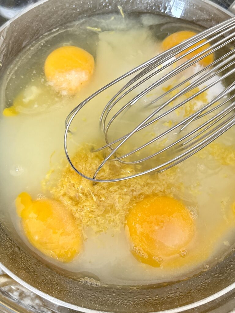 • In the bowl, whisk eggs, egg yolks, sugar, lemon juice, lemon zest, and salt until smooth.