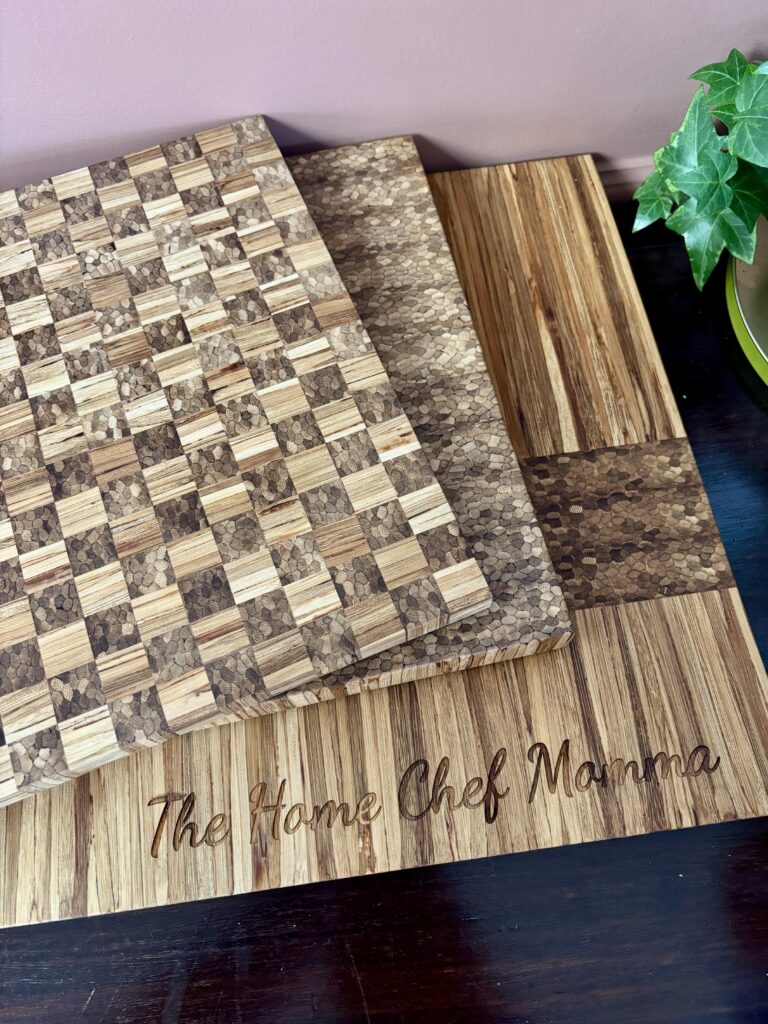 Serving boards and furniture that are beautifully crafted from recycled chopsticks. Sustainable, unique pieces that are functional and have a story to tell. Perfect host gift! I have a few boards and their end table. STUNNING!