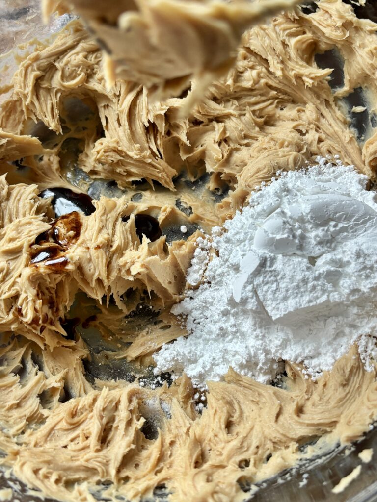 - Mix in powdered sugar, salt, and vanilla until combined.