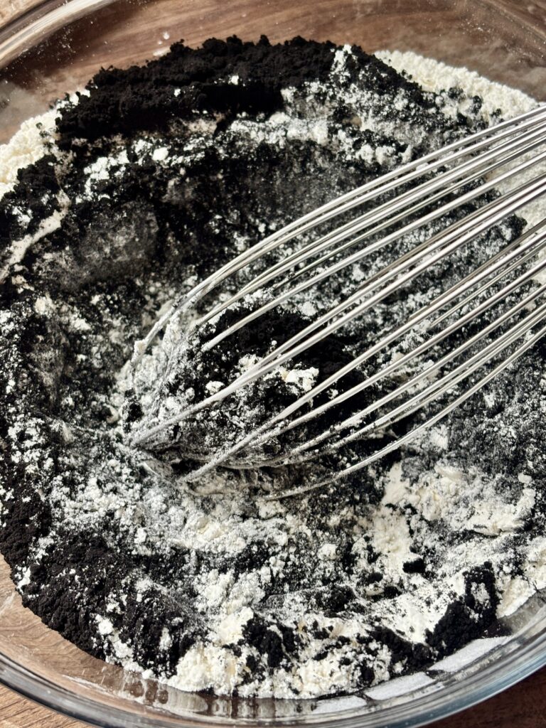 - Mix dry ingredients: In a medium bowl, whisk together flour, cornstarch, black cocoa, baking powder, baking soda, and salt. Set aside .