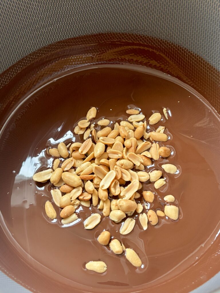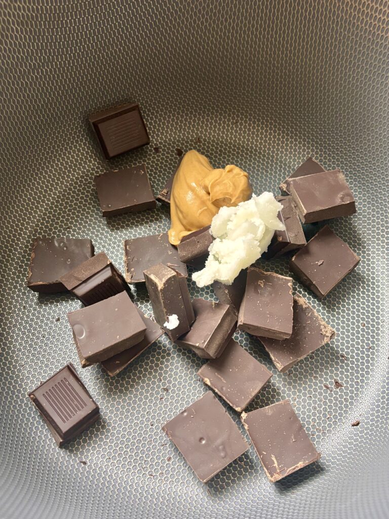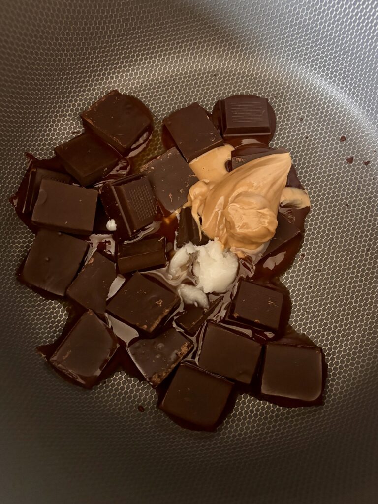 - In a heatproof bowl, melt the dark chocolate, coconut oil, and peanut butter until smooth.