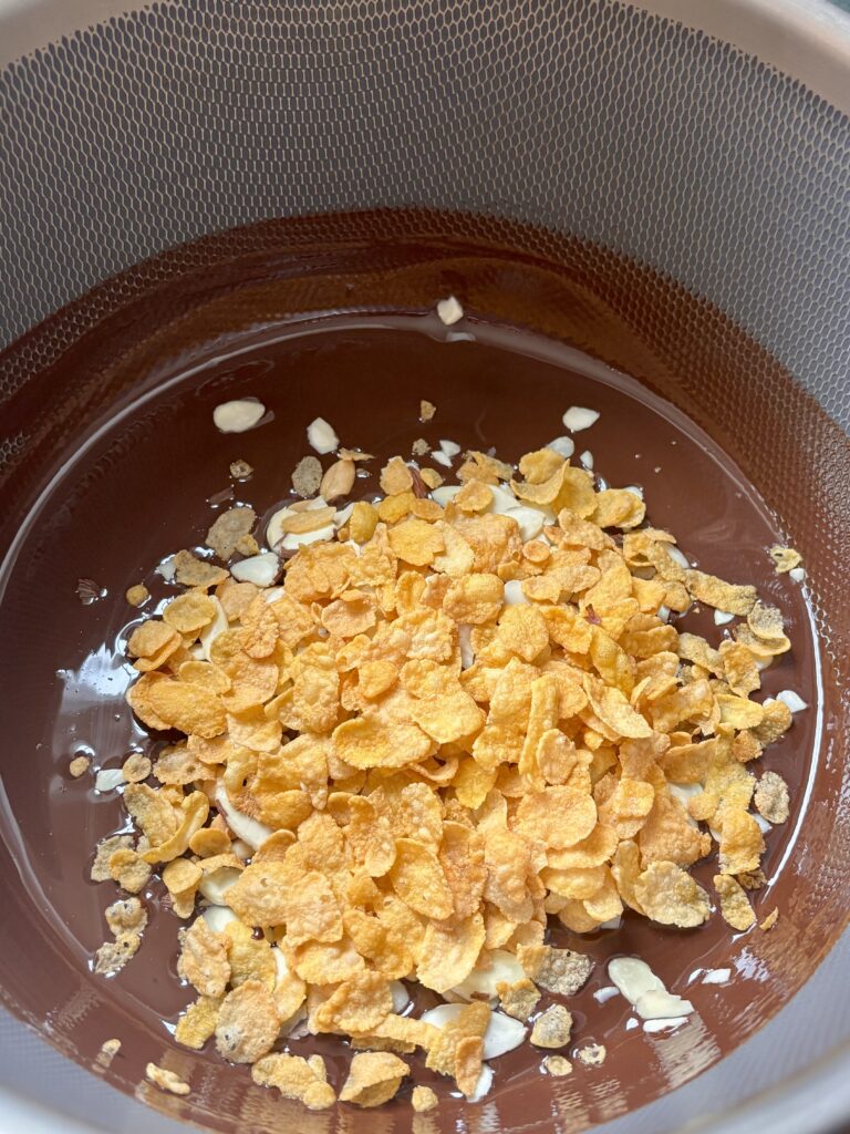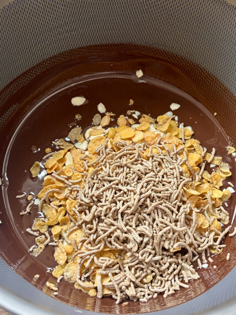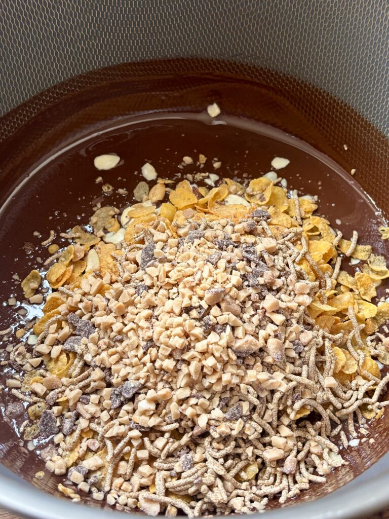 - Add toffee pieces, almonds, cornflakes, fiber cereal, and peanuts.