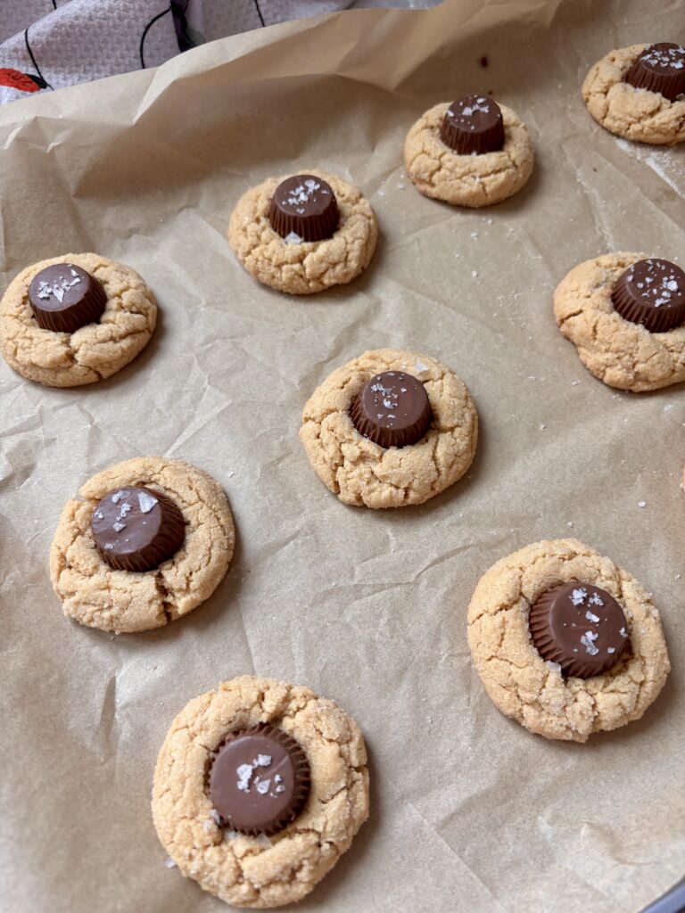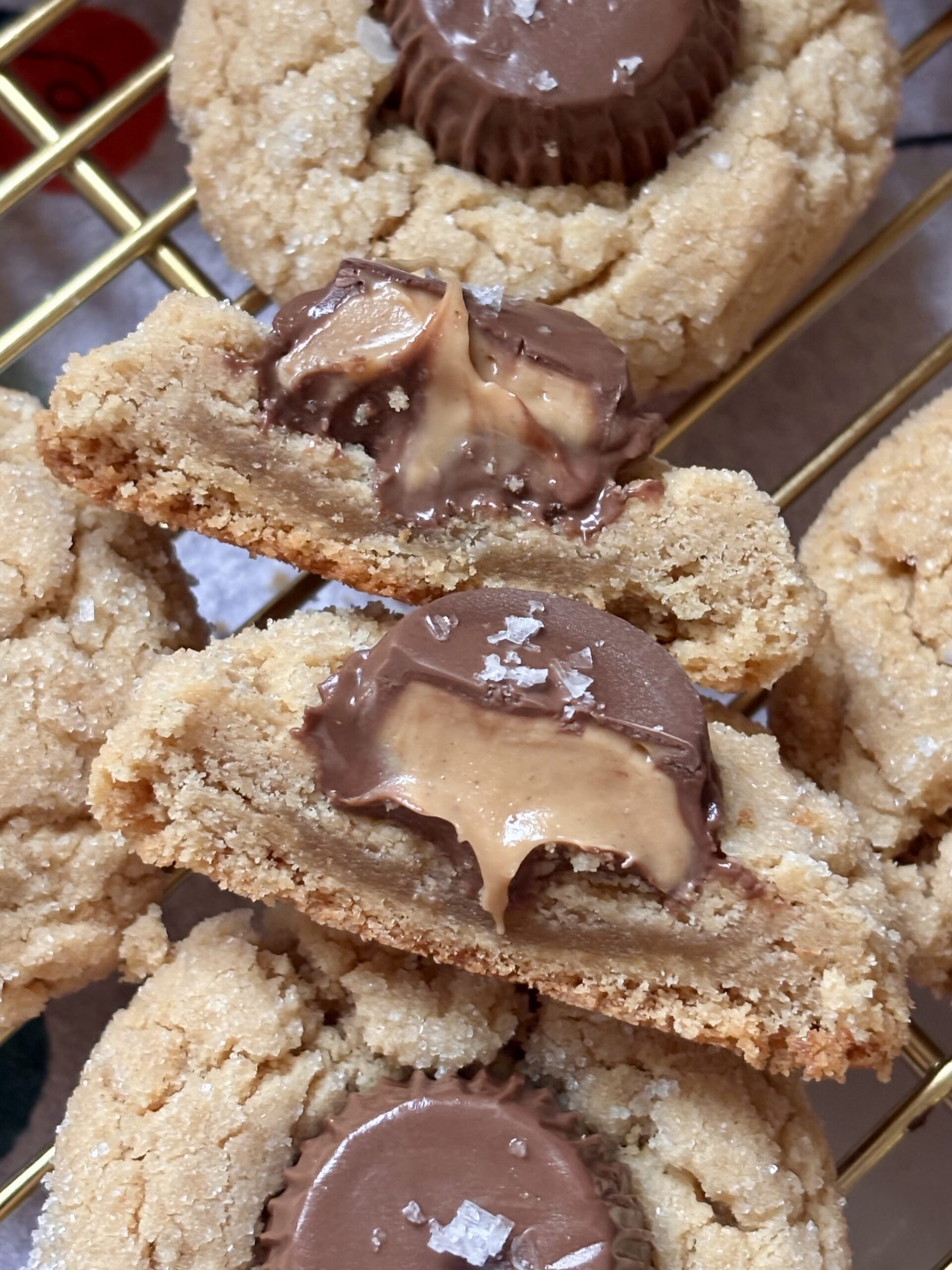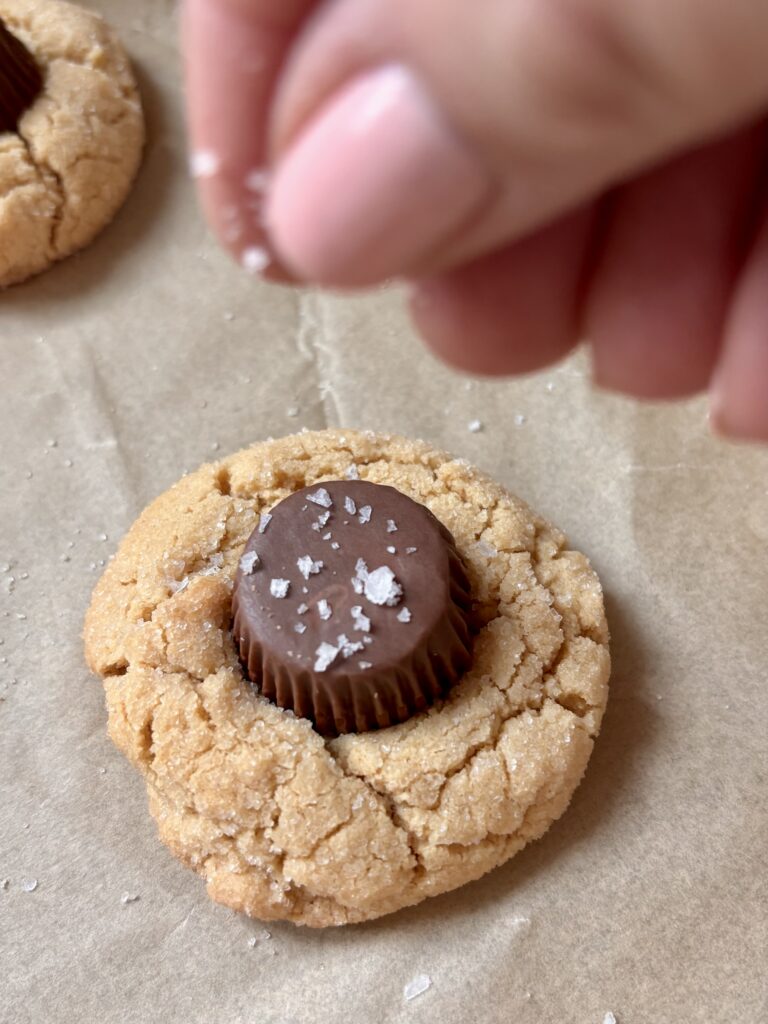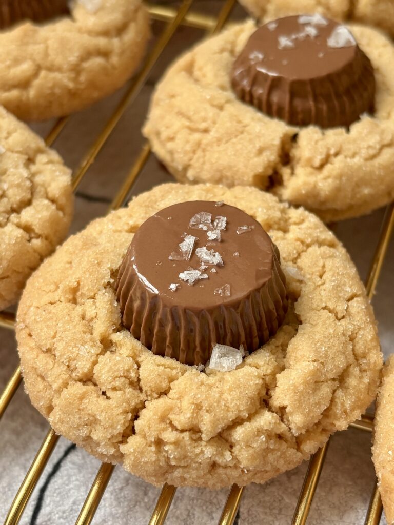 Soft peanut butter cookies rolled in granulated sugar, baked until just puffed, and finished with a melty peanut butter cup center and flaky sea salt.