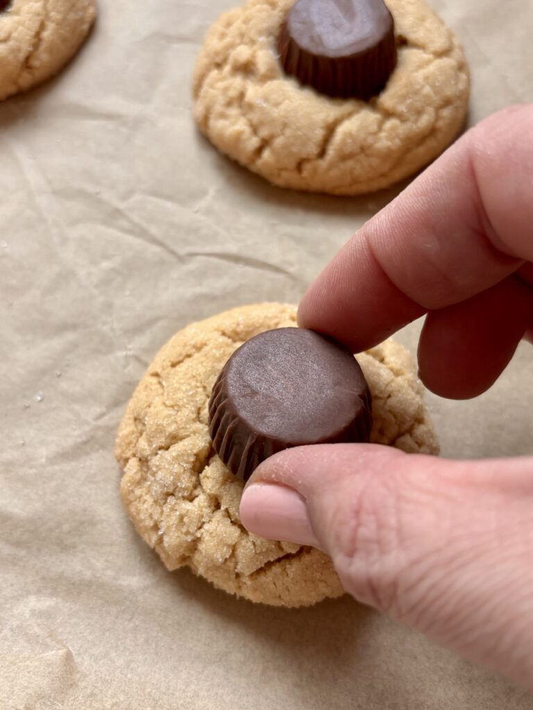 Press the peanut butter cups into the cookies immediately after baking while the cookies are still hot so they melt slightly and adhere well.