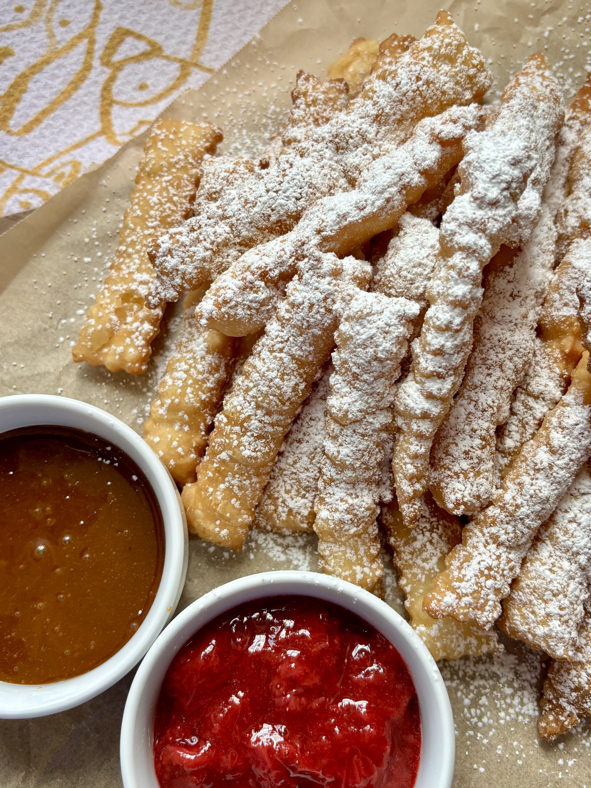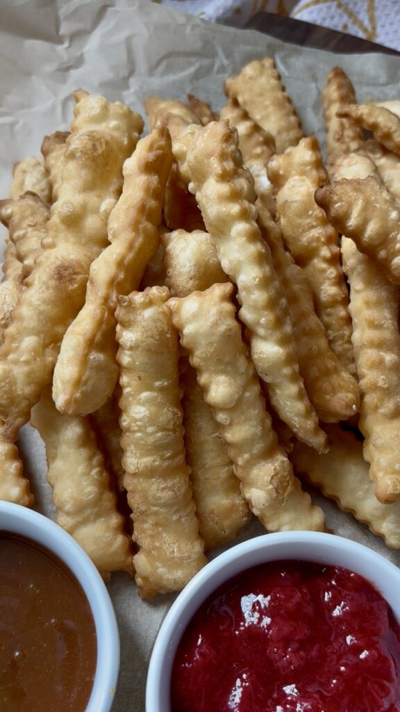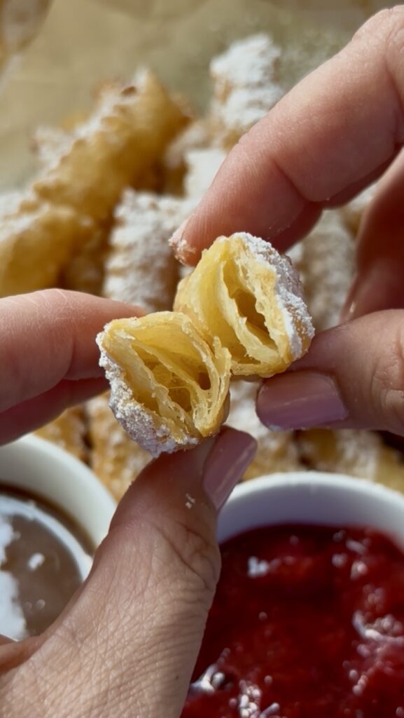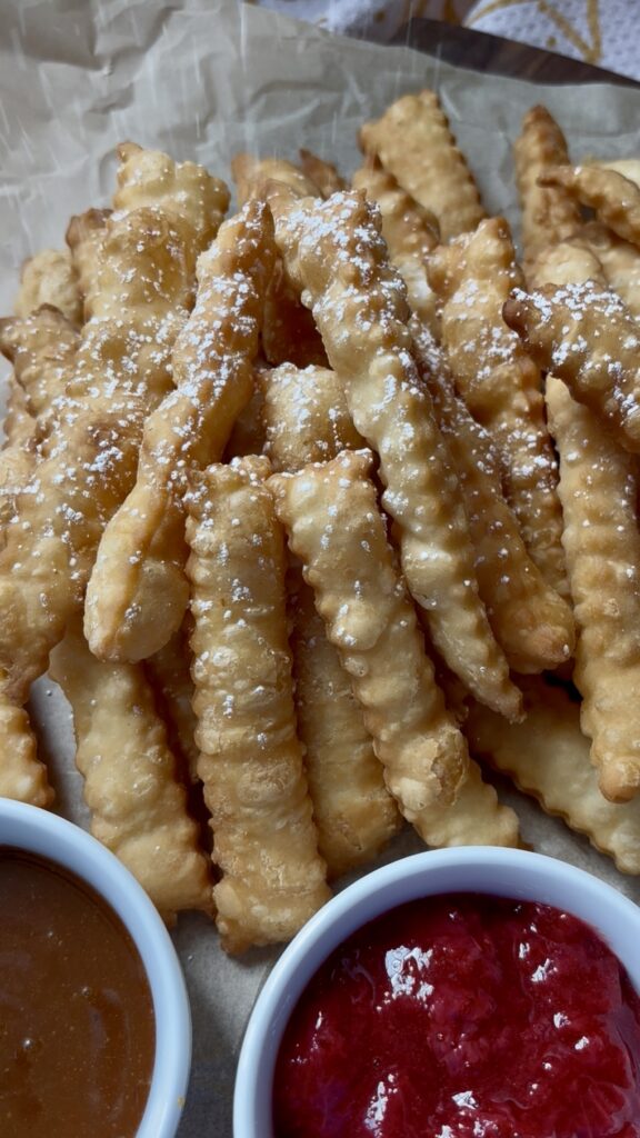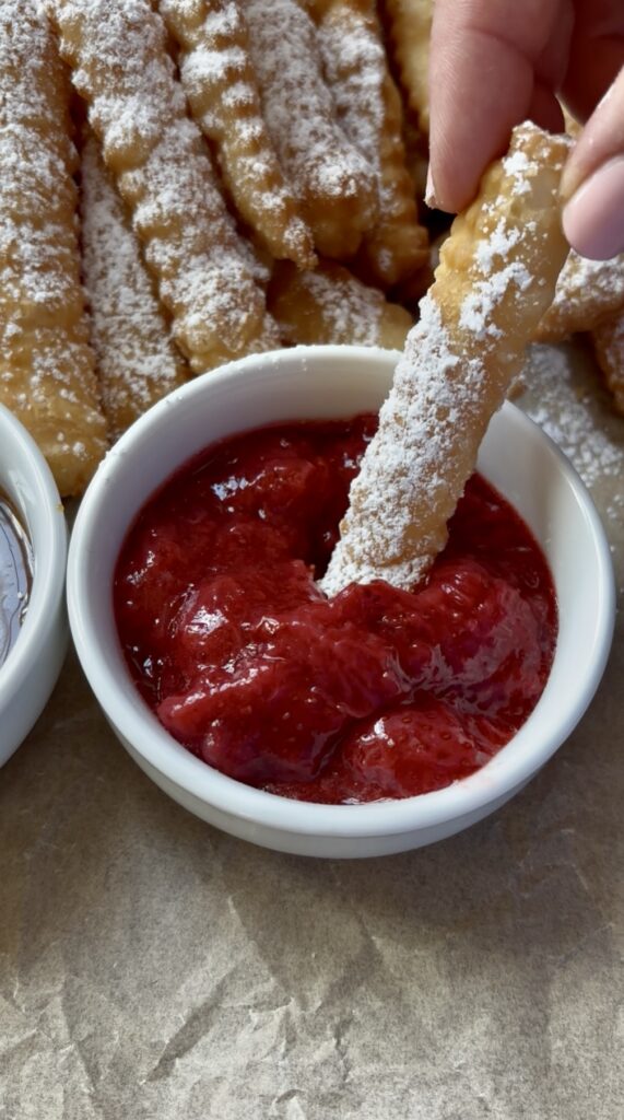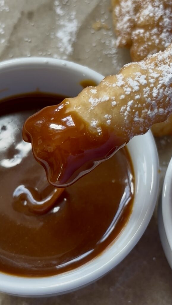 Made from simple strips of uncooked pie crust fried until puffed and flaky, these sweet little dippers are finished with a dusting of powdered sugar and served with warm caramel, chocolate sauce, or jam.
