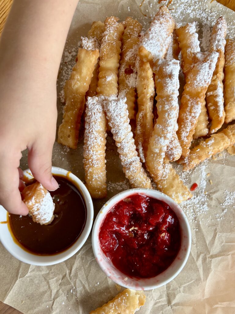 Kids can help roll and cut the dough and sprinkle powdered sugar, but frying should always be done by an adult for safety.