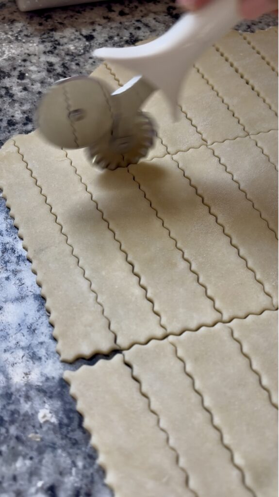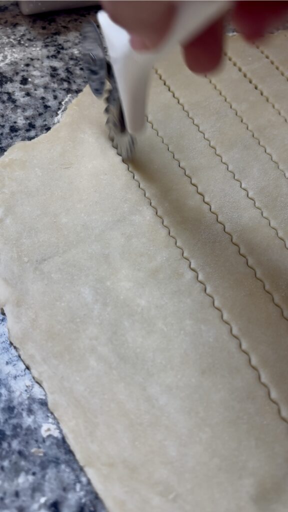 • Roll out uncooked pie dough until slightly less than ¼-inch thick. Cut into ½–¾” wide strips, then cut into your desired length.