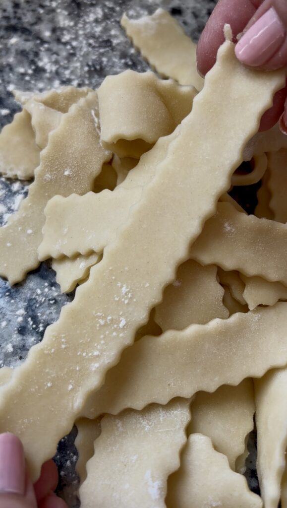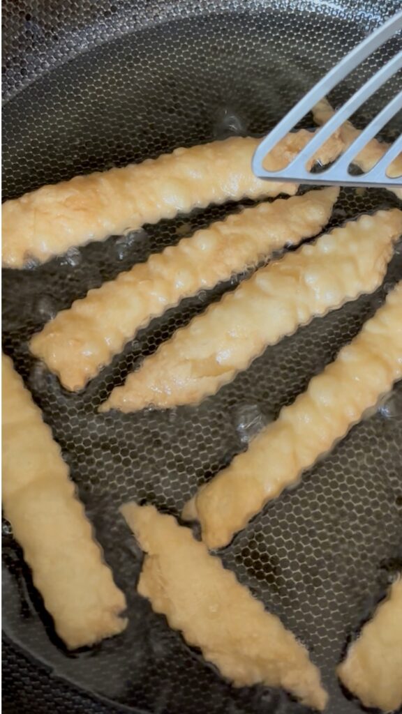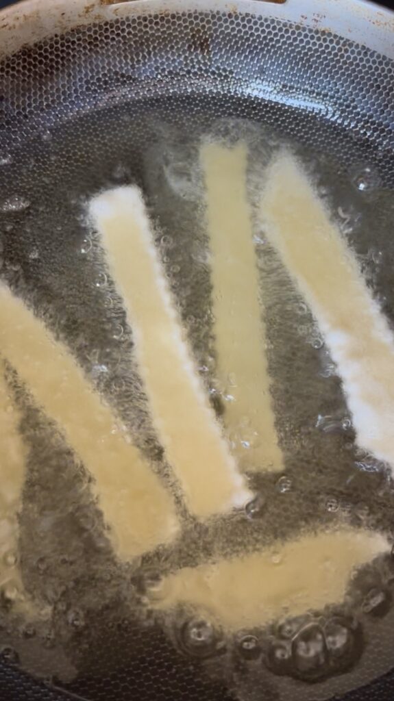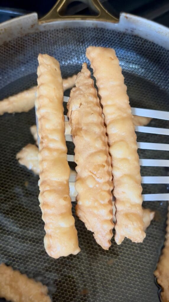 • Don’t overcrowd the pan. Only add a few strips of dough to the oil at a time for more even browning.