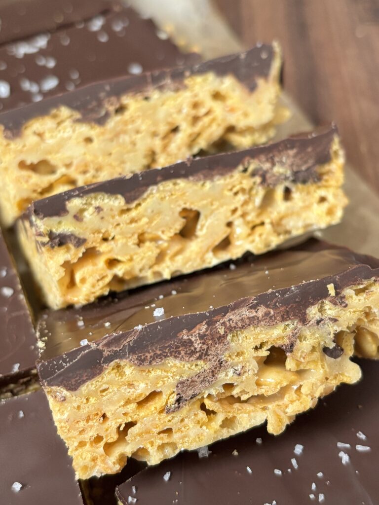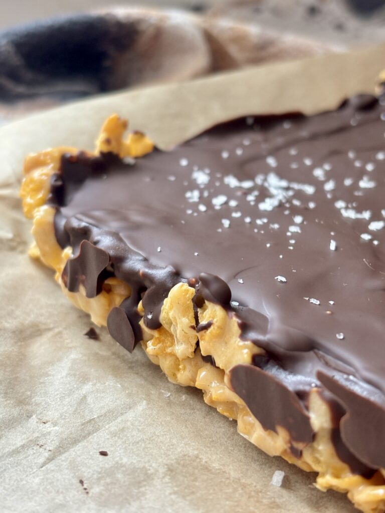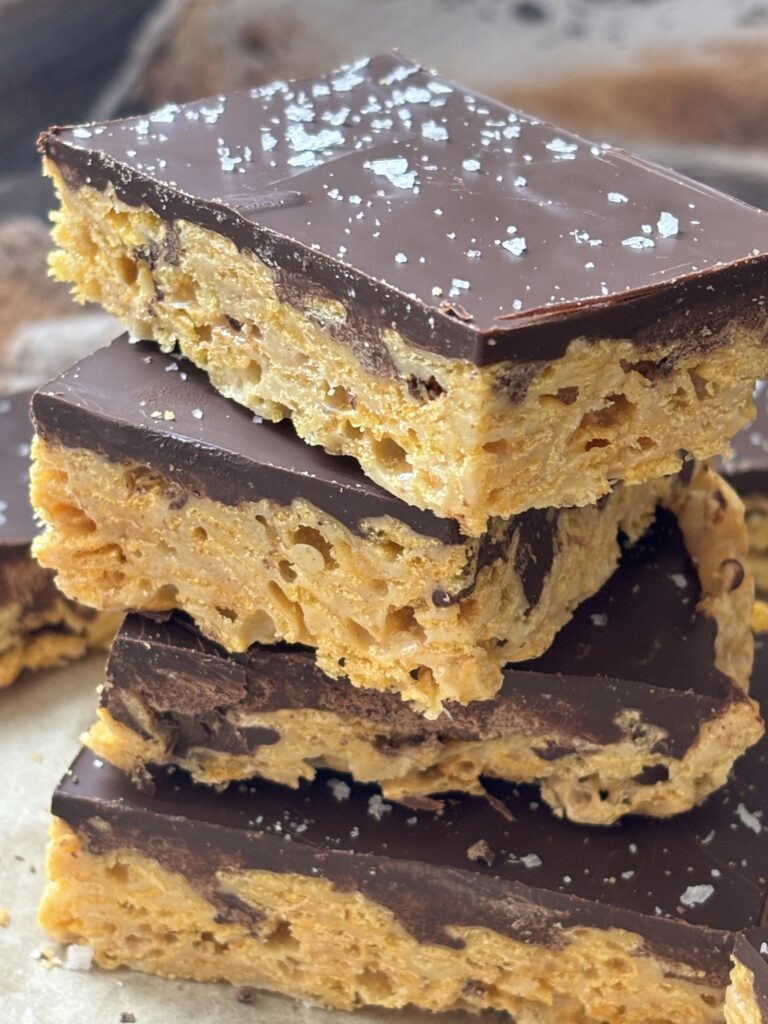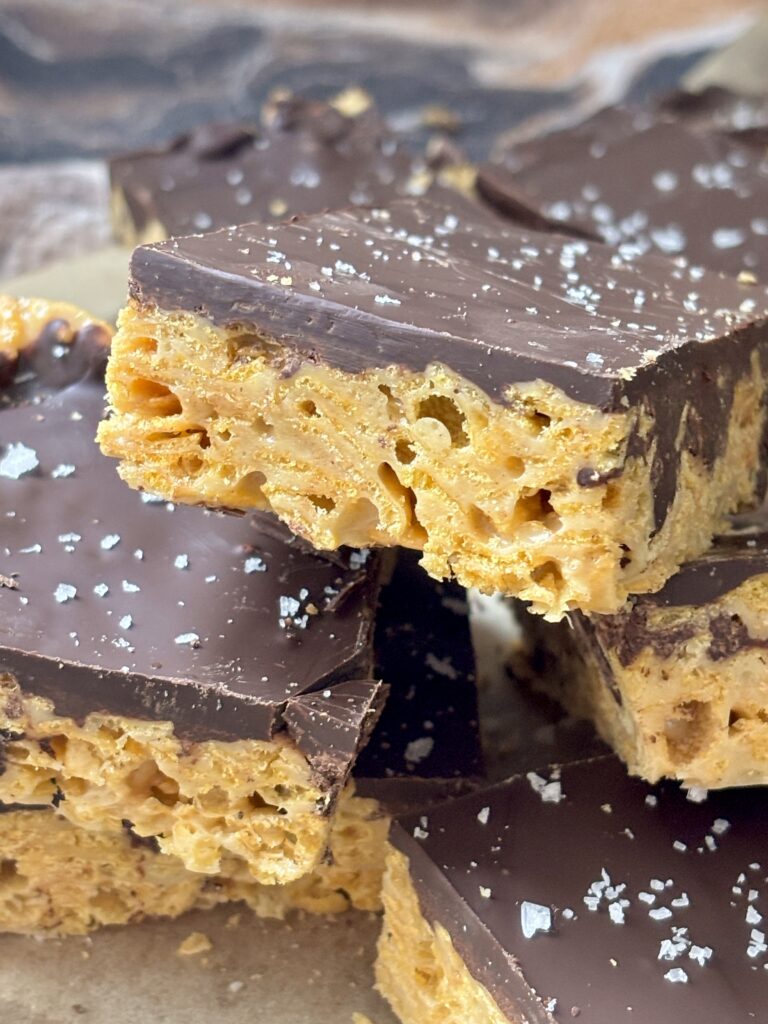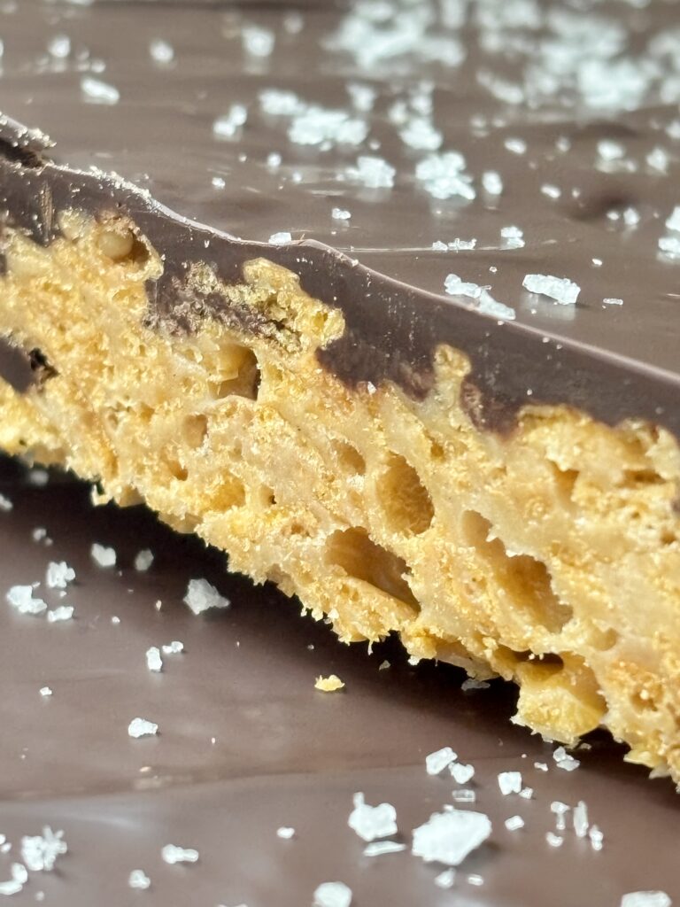 The base combines gooey marshmallows with butter and creamy pistachio butter, folding in crisp cornflakes for that perfect crunch. The bars are topped with rich dark chocolate topping and finished with flaky sea salt for an elevated flavor profile.