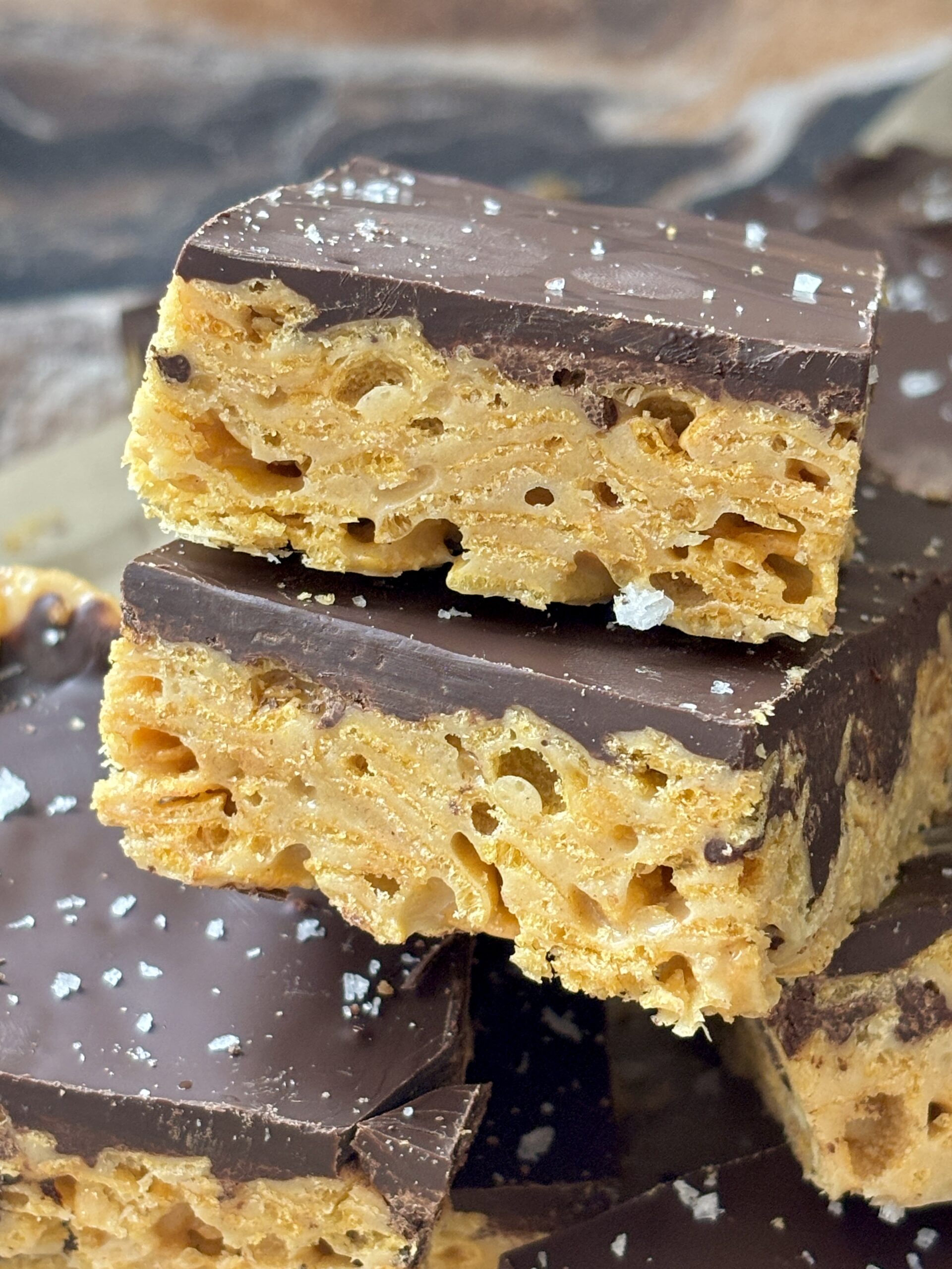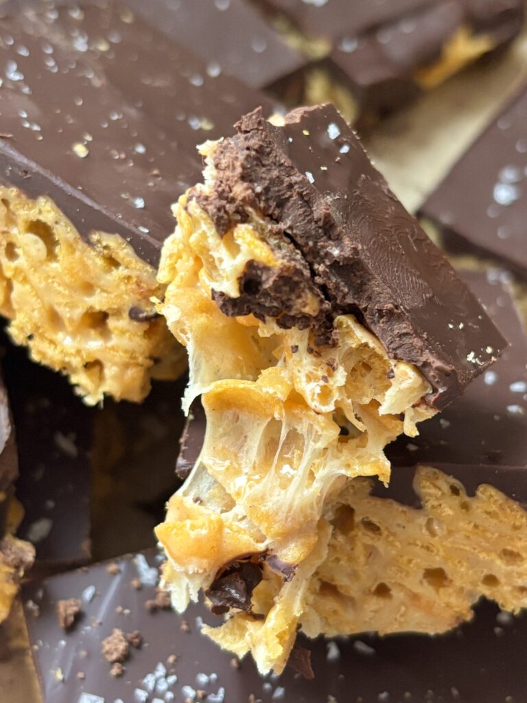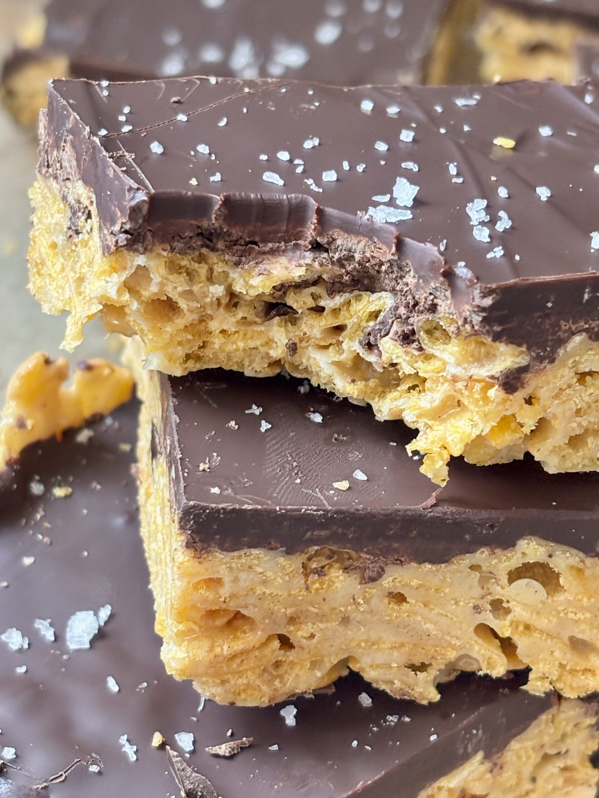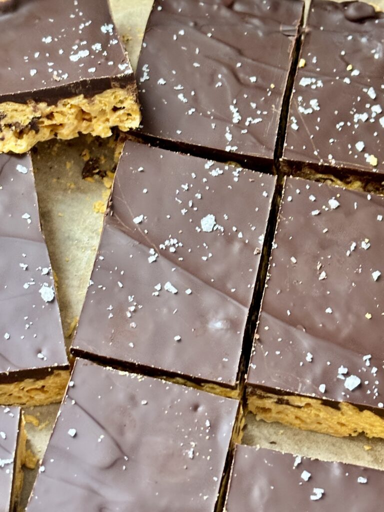 The base combines gooey marshmallows with butter and creamy pistachio butter, folding in crisp cornflakes for that perfect crunch. The bars are topped with rich dark chocolate topping and finished with flaky sea salt for an elevated flavor profile.