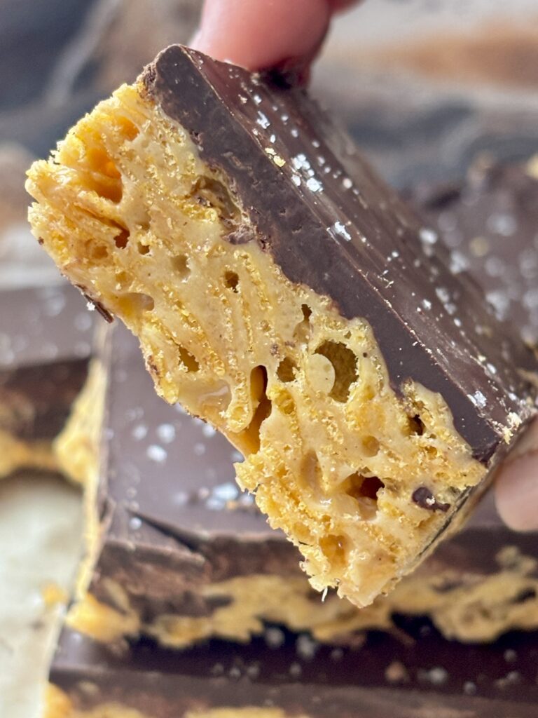 These Pistachio Cornflake Crunch Bars are a fun twist on classic marshmallow treats. Think pistachio Rice Krispies meets cornflakes, finished with a thick layer of dark chocolate and a sprinkle of flaky sea salt. The bars are sweet, nutty, lightly salty, while being crispy, chewy, and chocolatey all in one bite. Completely addictive!