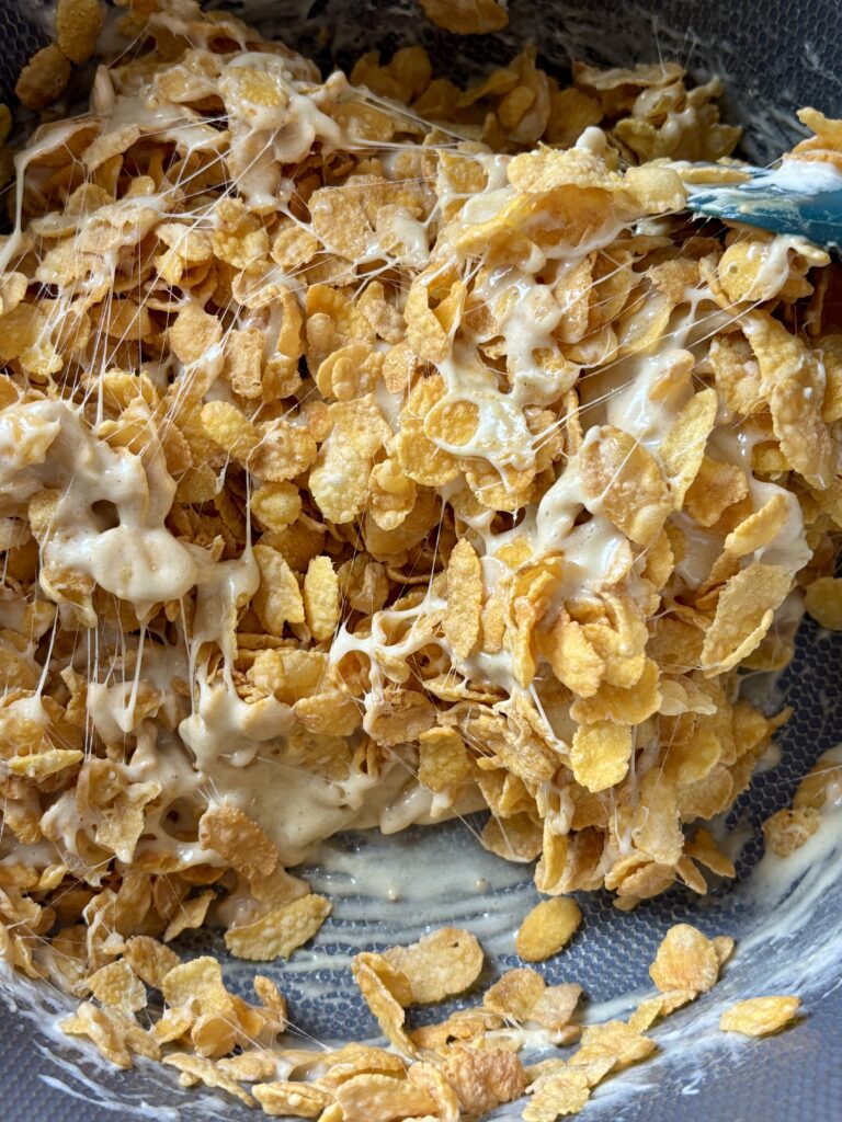 - Remove from heat and gently fold in cornflakes until coated.