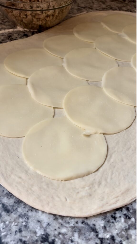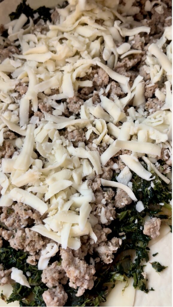 • Line dough with provolone cheese slices. Then spread spinach mix on top. Add the pork crumbles evenly and then spread the mozzarella cheese on top. Sprinkle with oregano and garlic powder.