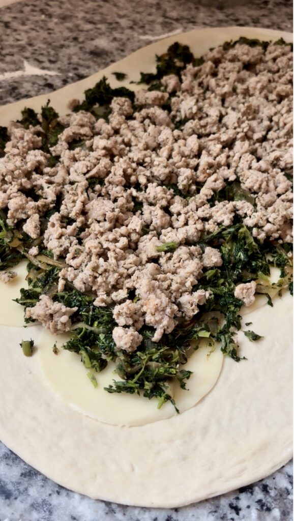 Pro tip: allow the spinach and pork to cool before adding to the pizza dough.  Otherwise the dough can get soggy.