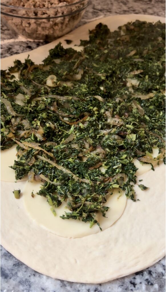 • Add another tbsp of olive oil to the pan and add the sliced onions. Cook over medium heat, stirring frequently until deeply browned and caramelized. Add the spinach (excess water squeezed out) to the caramelized onions and stir to combine. Set aside to cool.