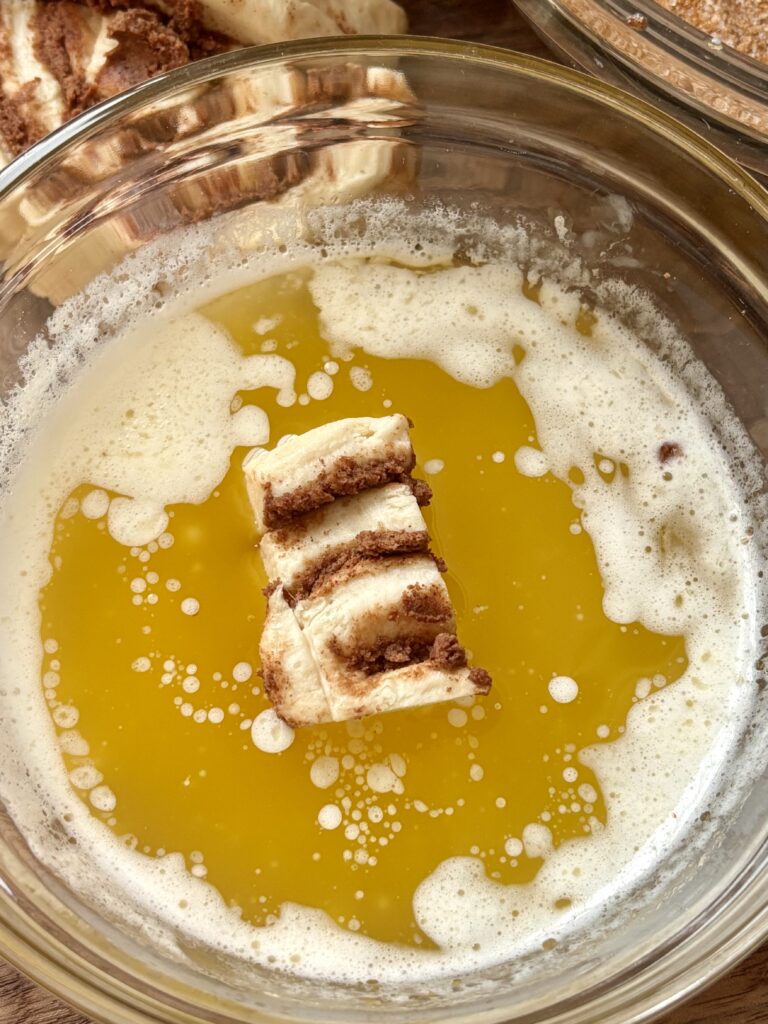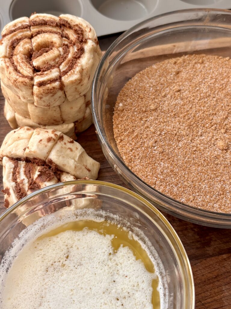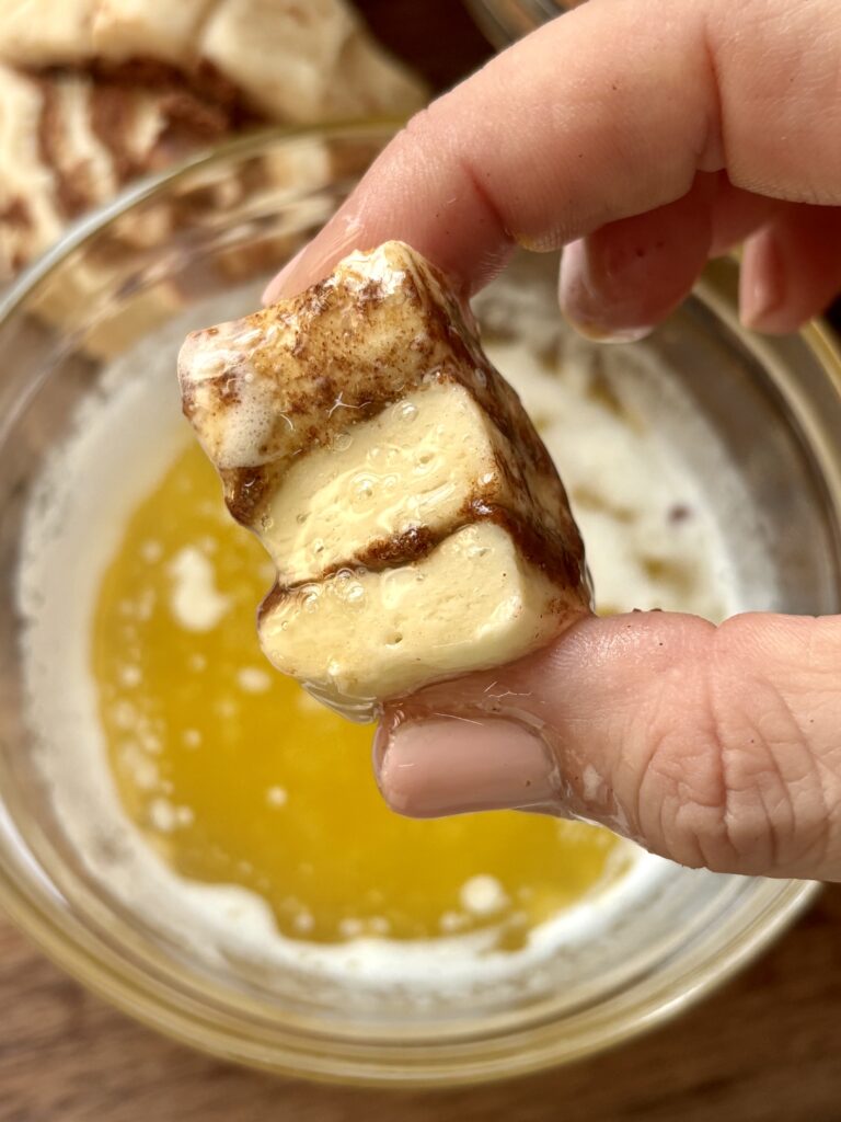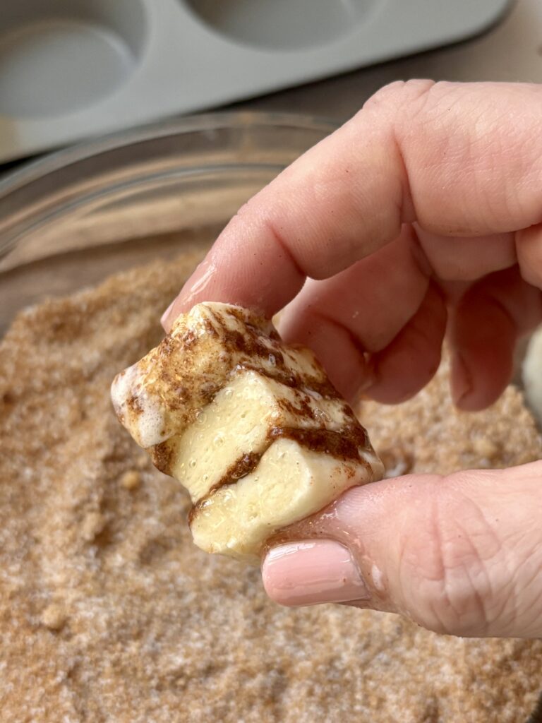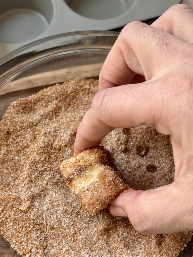 • Dip each cinnamon roll piece into the melted butter, then roll in the cinnamon-sugar mixture.