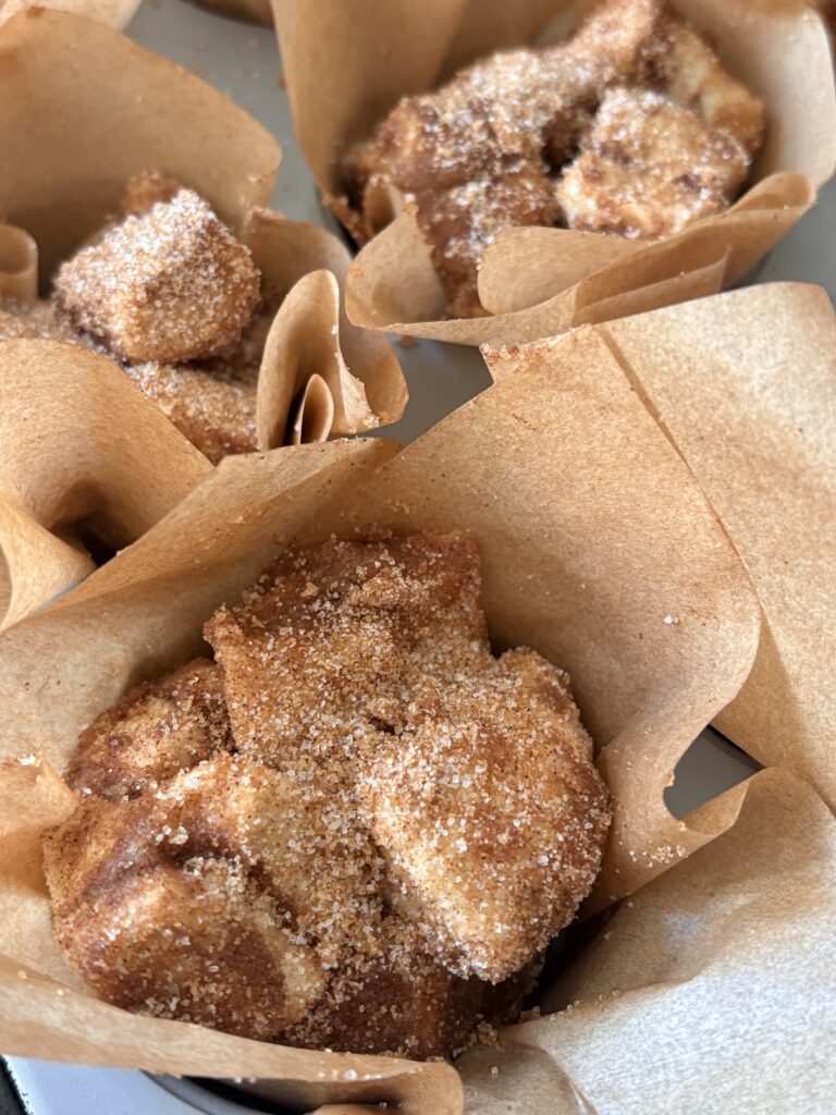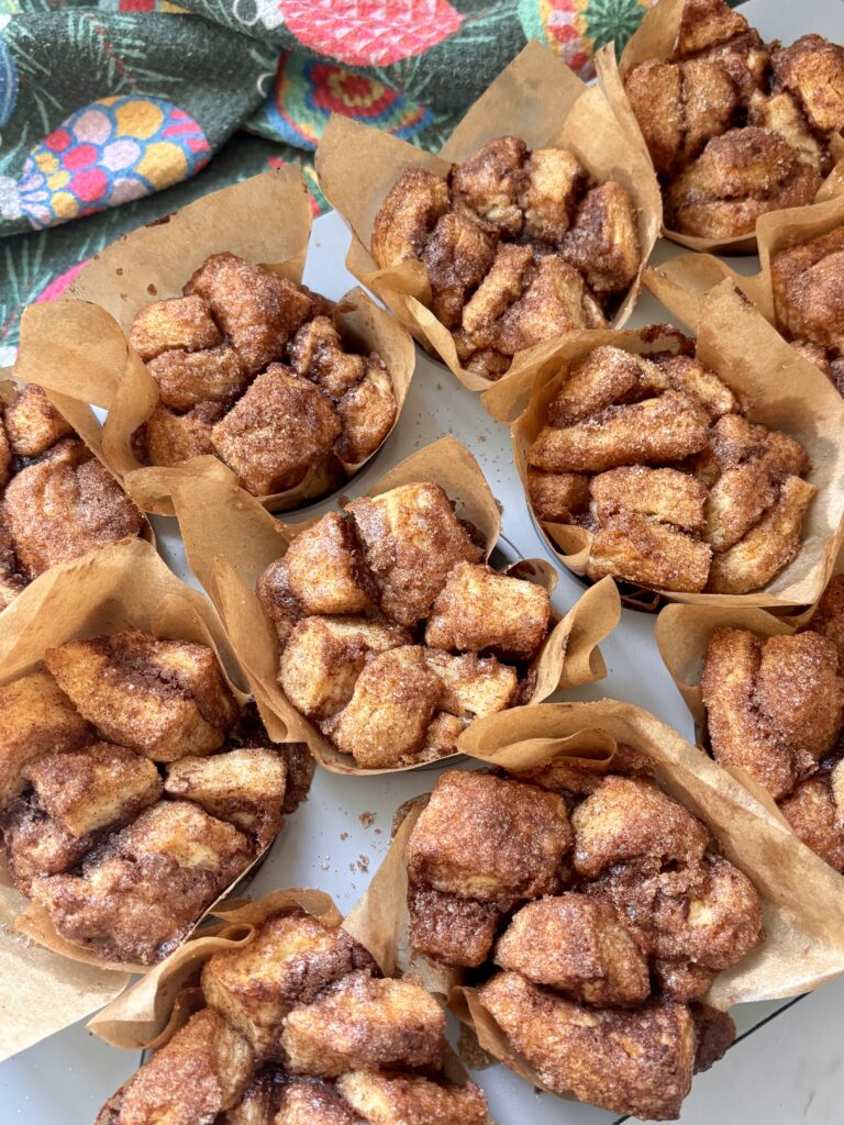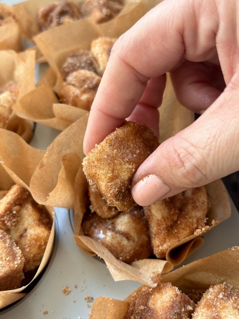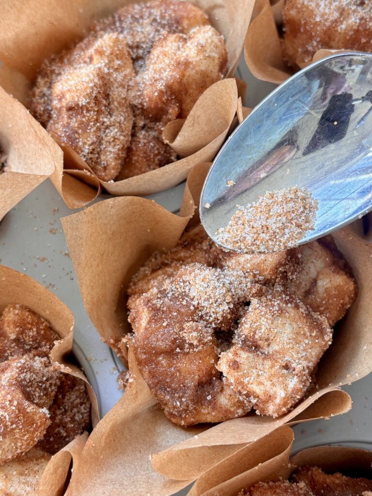 • Add 5 coated dough pieces to each well. Sprinkle any leftover cinnamon-sugar evenly over the tops.