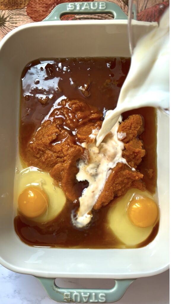 - Add the pumpkin, eggs, maple syrup, milk, and vanilla to the baking dish. Whisk to combine.