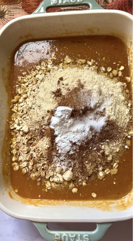 - Add in the oats, almond flour, flaxseed, baking powder, cinnamon, pumpkin pie spice, and salt. Stir until combined.