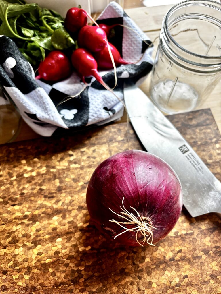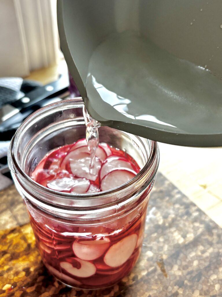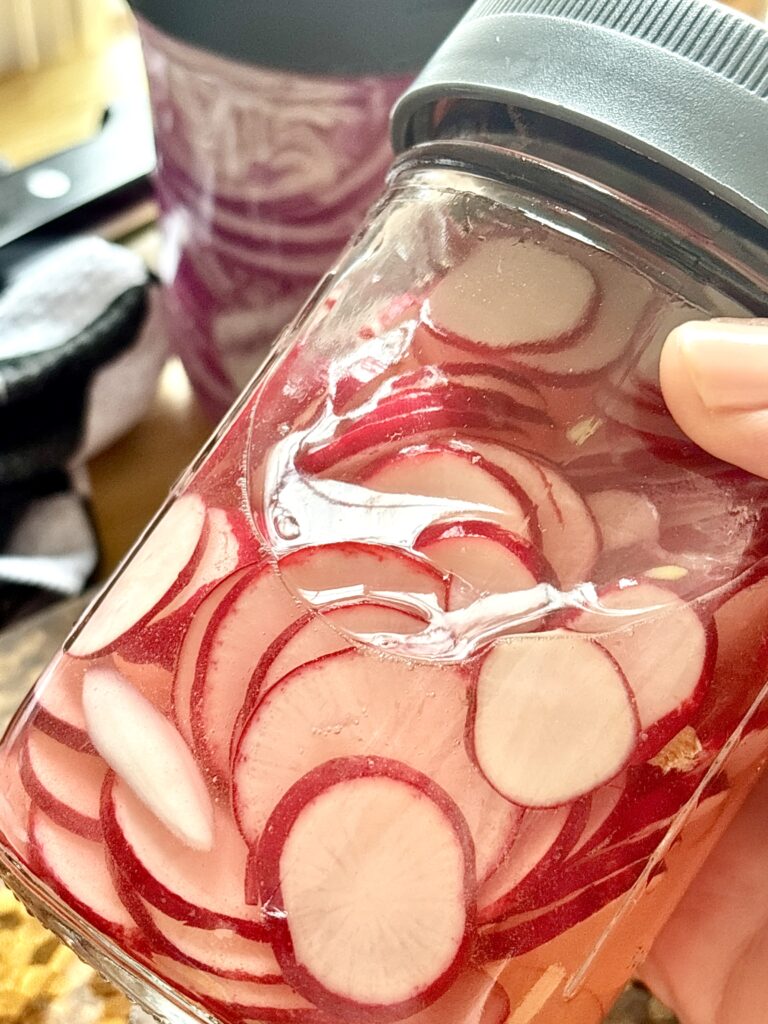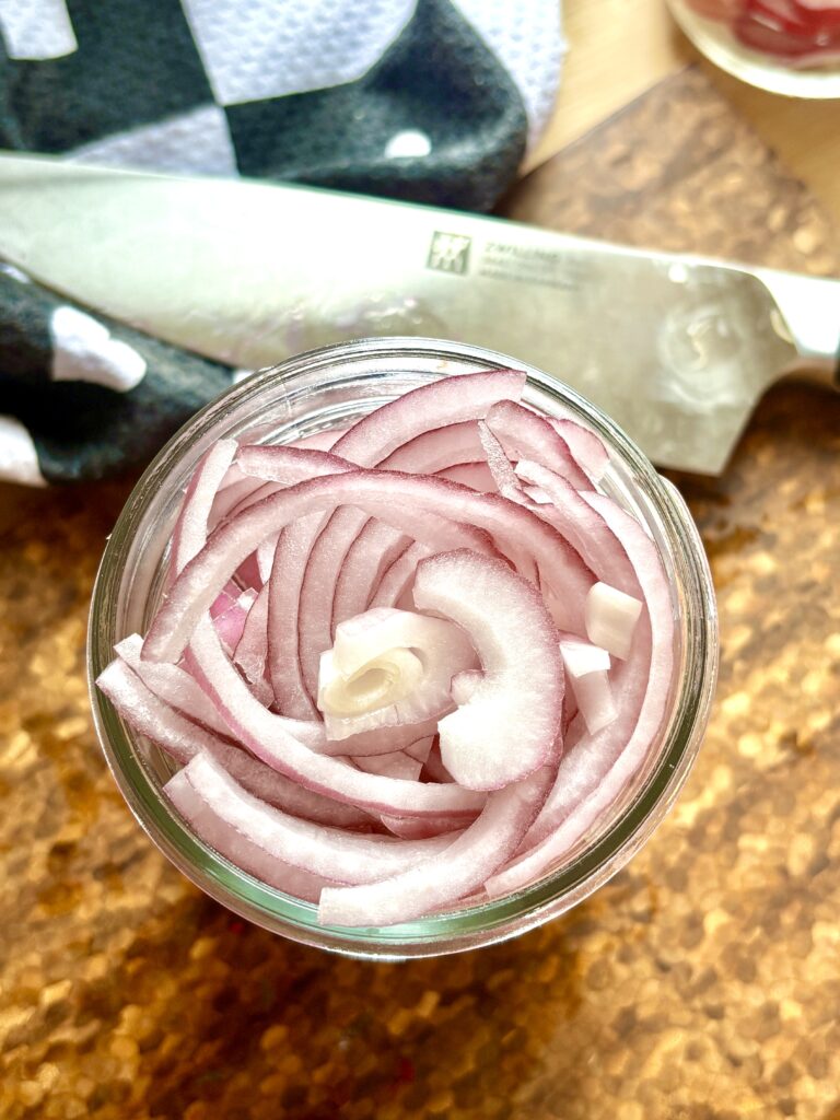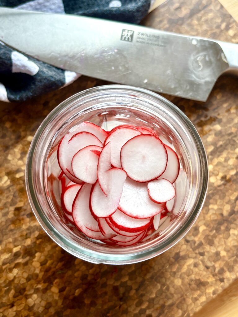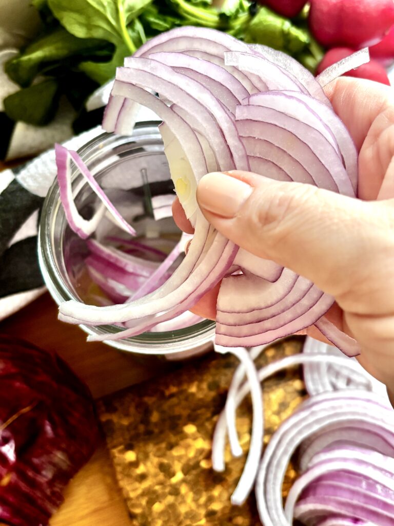 - Thinly slice onion or radishes and place in a heat safe jar.