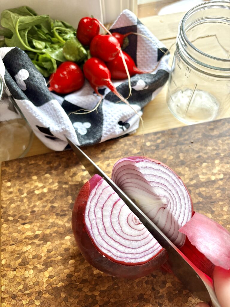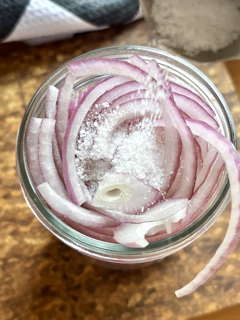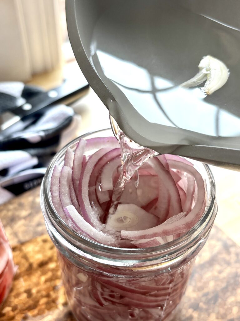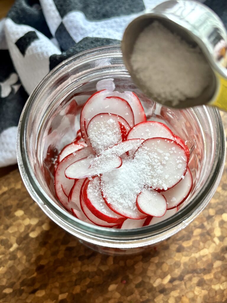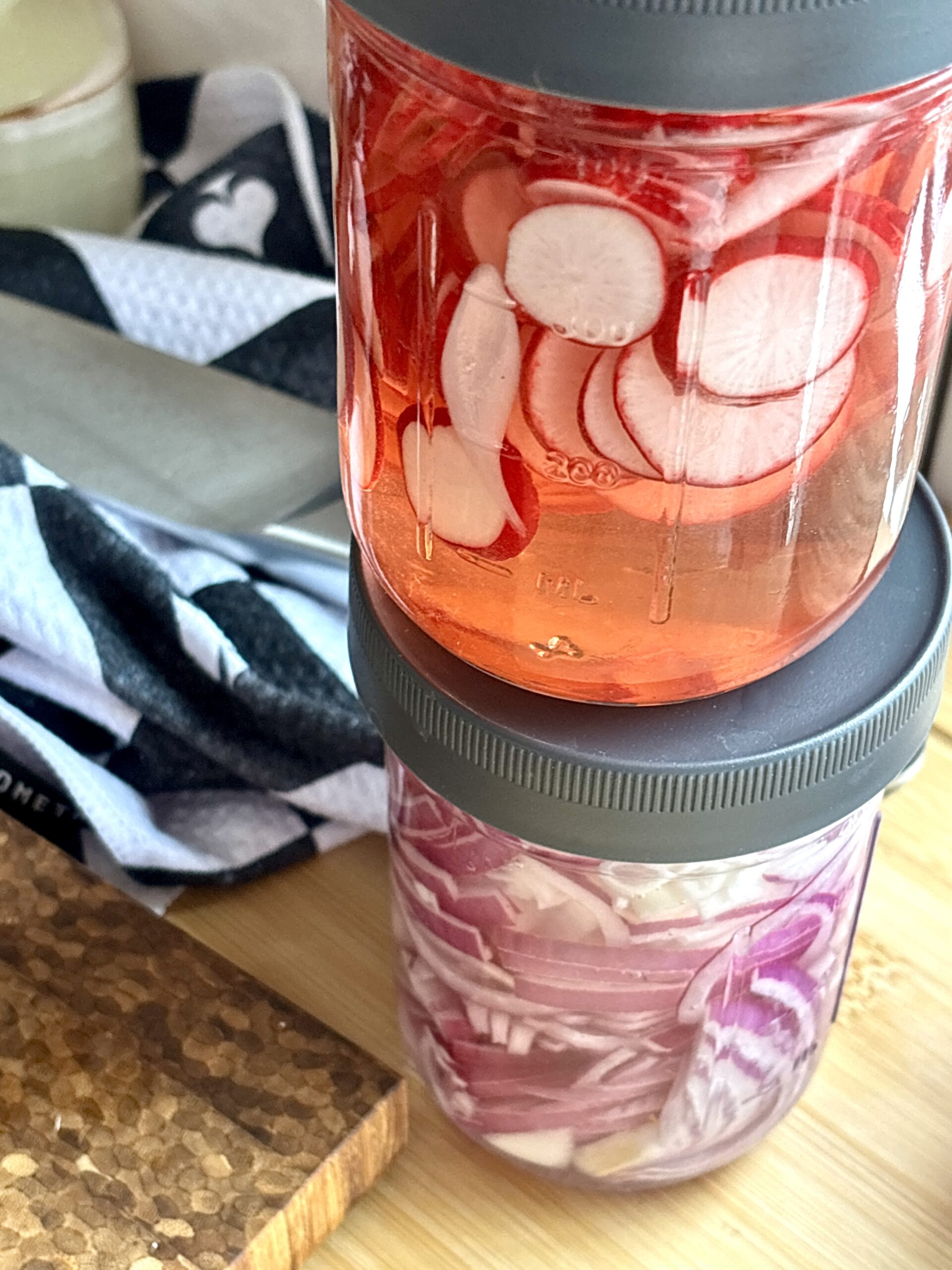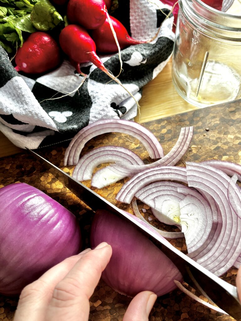 - Thinly slice onion or radishes and place in a heat safe jar.