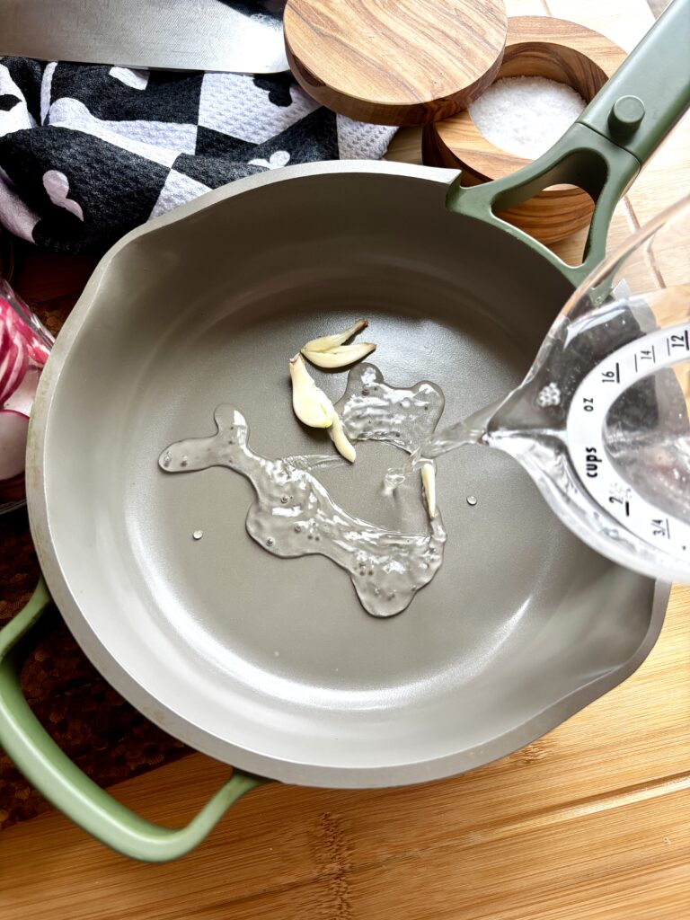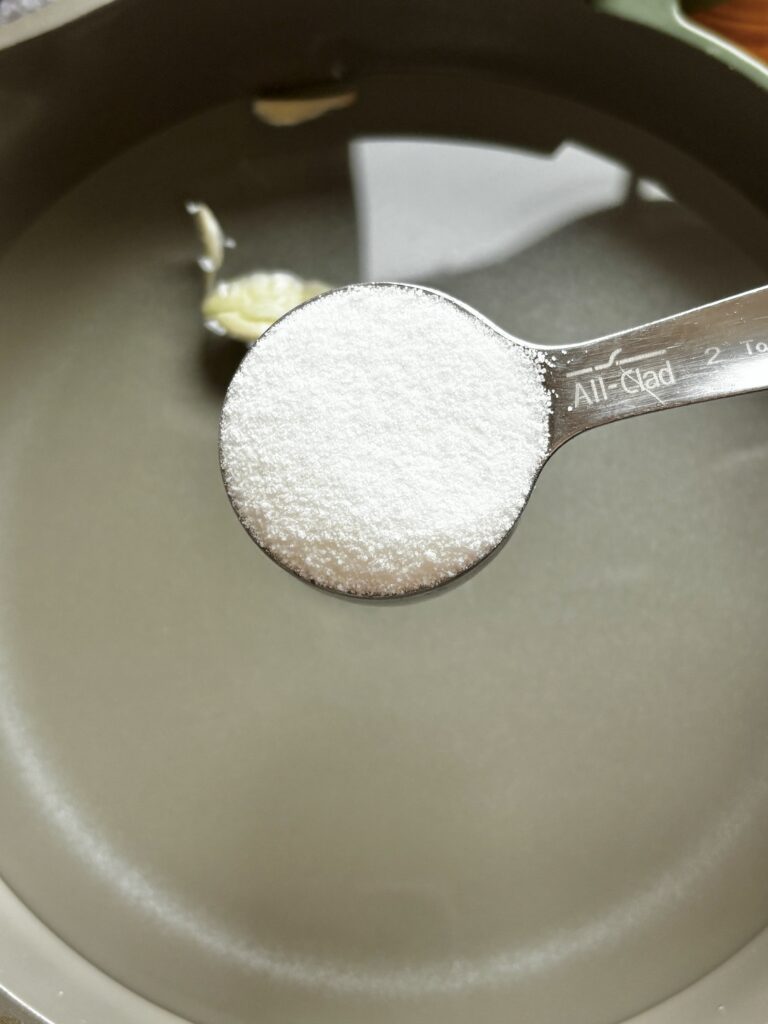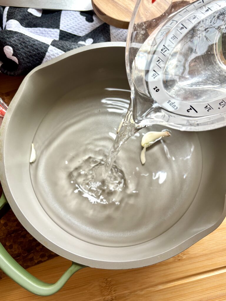 - In a saucepan over medium-low, heat water, vinegar, sugar, and garlic until sugar dissolves. Do not boil.