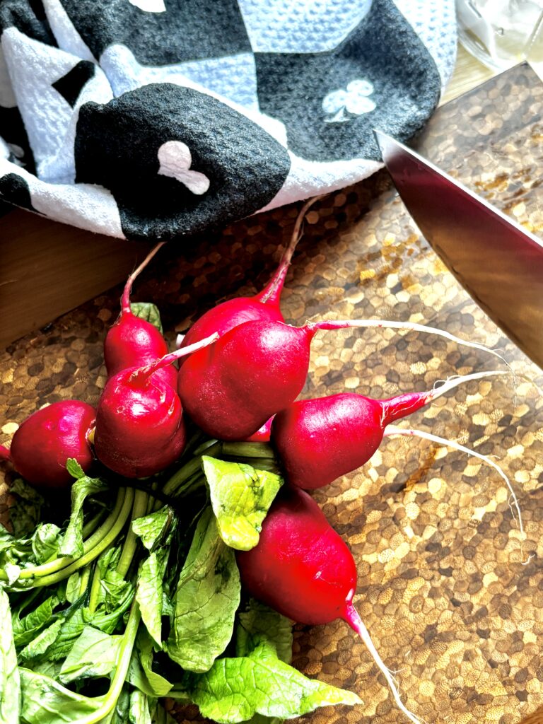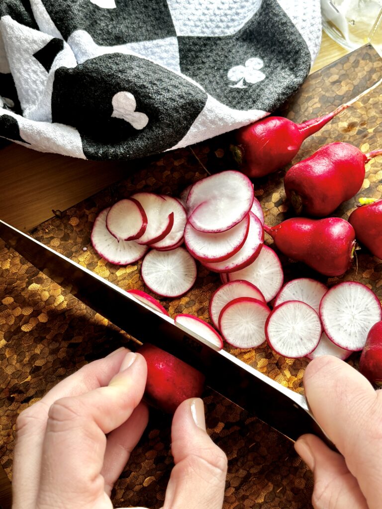 - 1 large red onion thinly sliced or a large bunch of radishes, sliced thinly