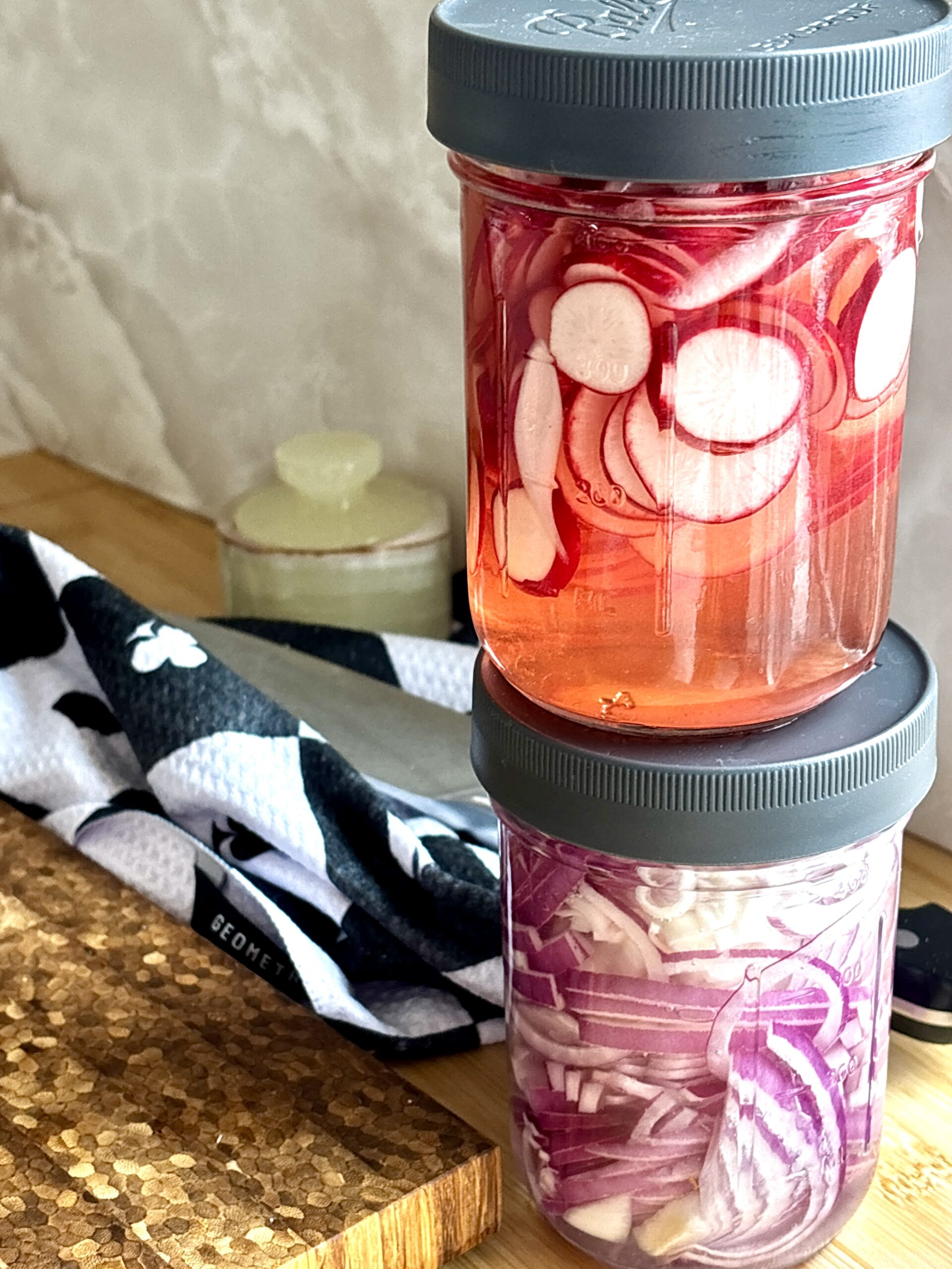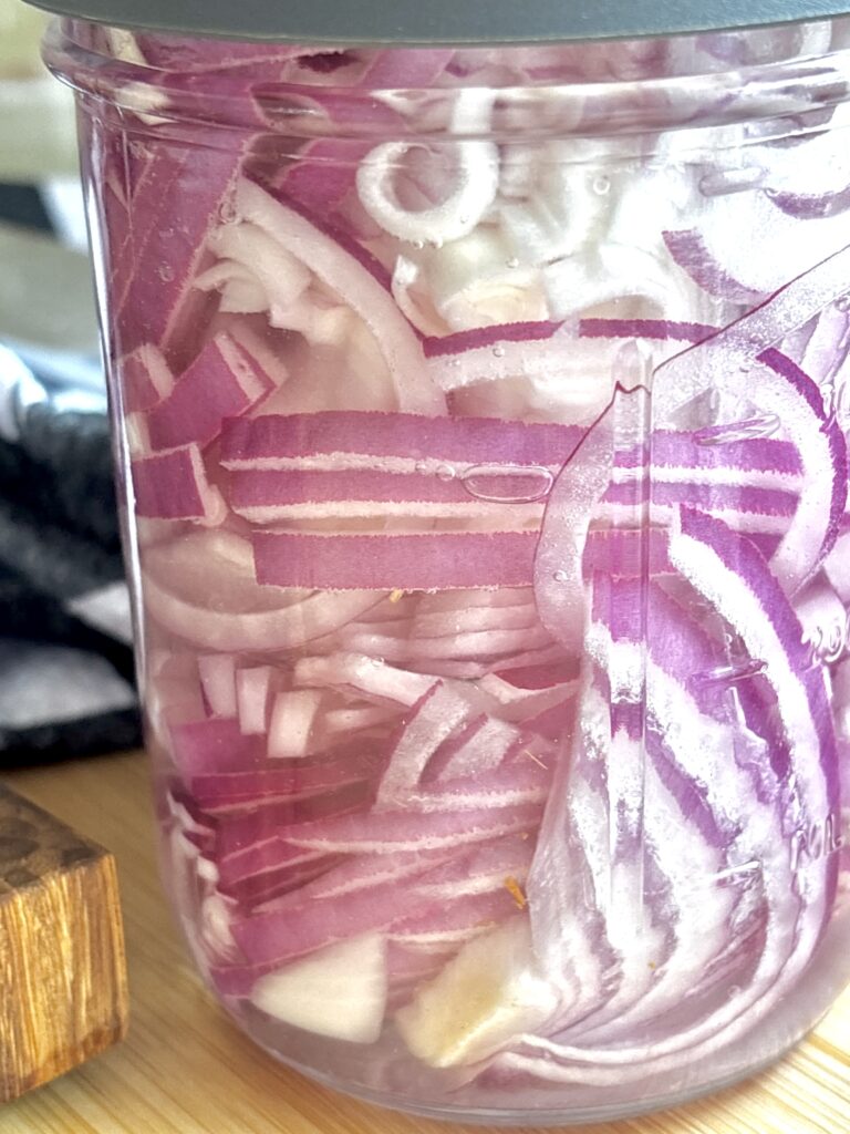 This recipe shows both red onions and radishes pickled separately, but using the same simple brine. The recipe below makes one jar, so if you want both vegetables, simply double the recipe. These pickled vegetables can last up to 2–3 weeks in the refrigerator, making them perfect for meal prepping, entertaining, or adding a quick upgrade to everyday dinners.