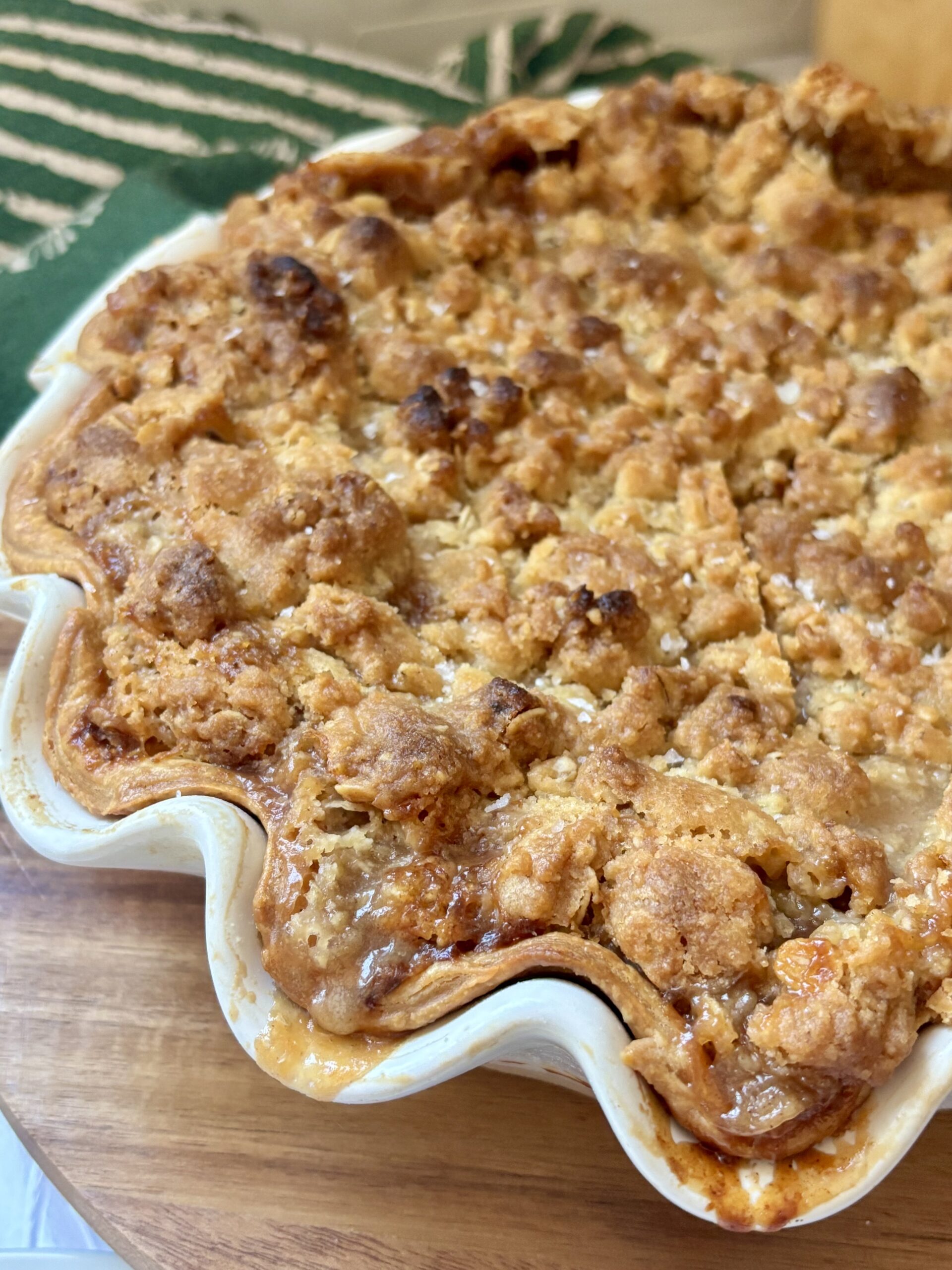 This Salted Caramel Apple Crumble Pie is the ultimate fall dessert—warm, gooey, buttery, and bursting with cozy holiday flavor.