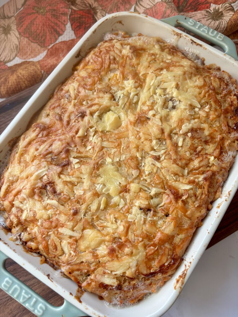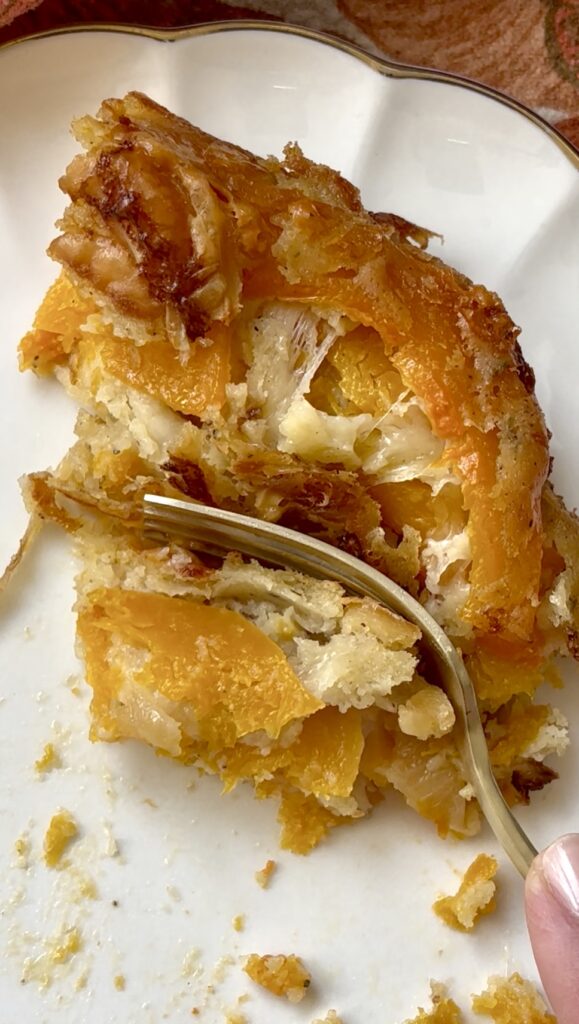 Topped with melty Gruyère, it bakes to a golden, crisp perfection while staying soft and custardy inside — part gratin, part savory bread pudding.