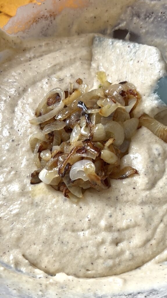 - In a skillet over medium-low heat, add olive oil, onions, and garlic. Cook slowly, stirring occasionally, for 15–20 minutes until golden and soft. Remove from heat and let cool slightly.