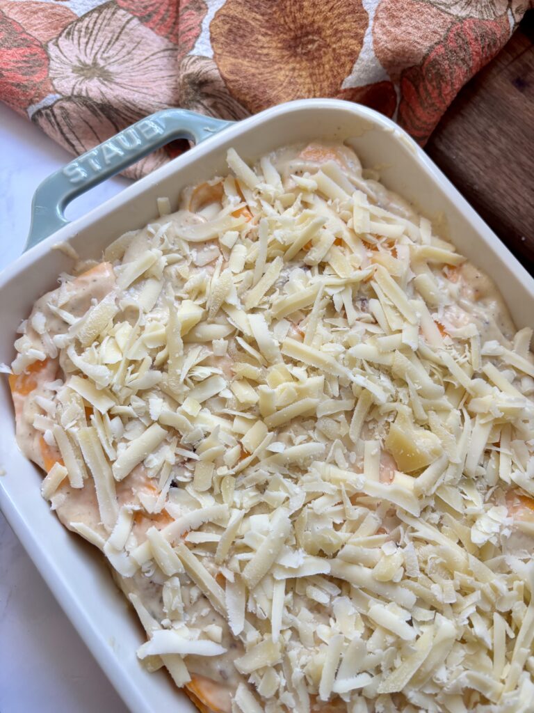 - For this bake, freshly shredded Gruyère ensures a gooey, golden, and perfectly melty top layer.