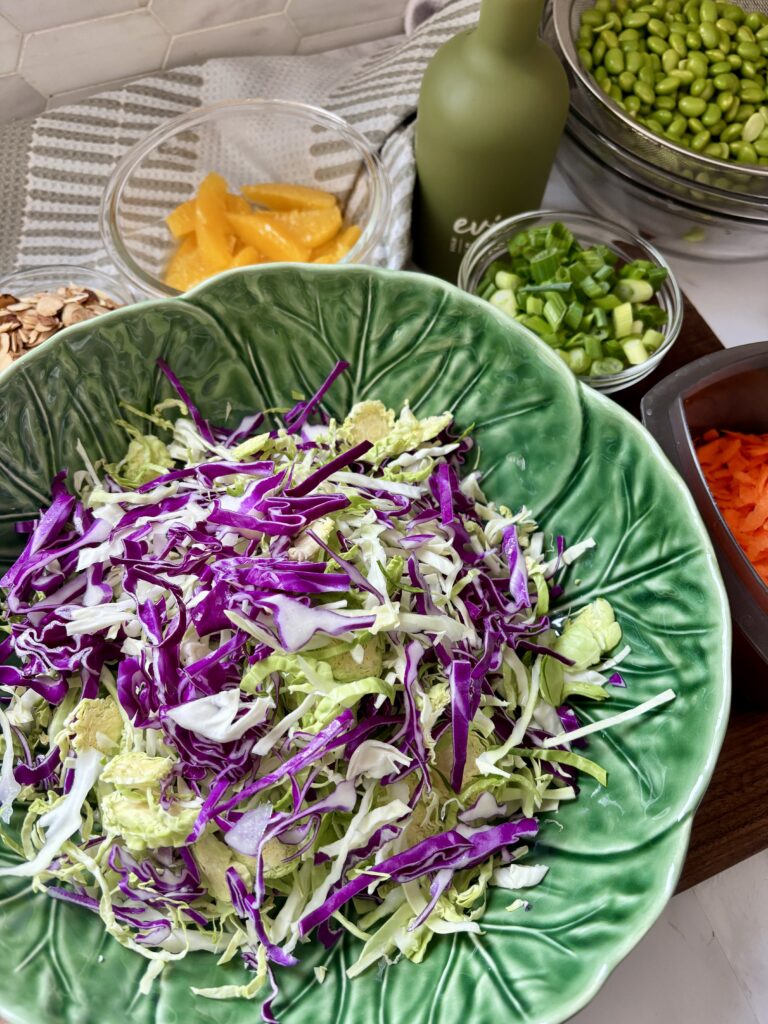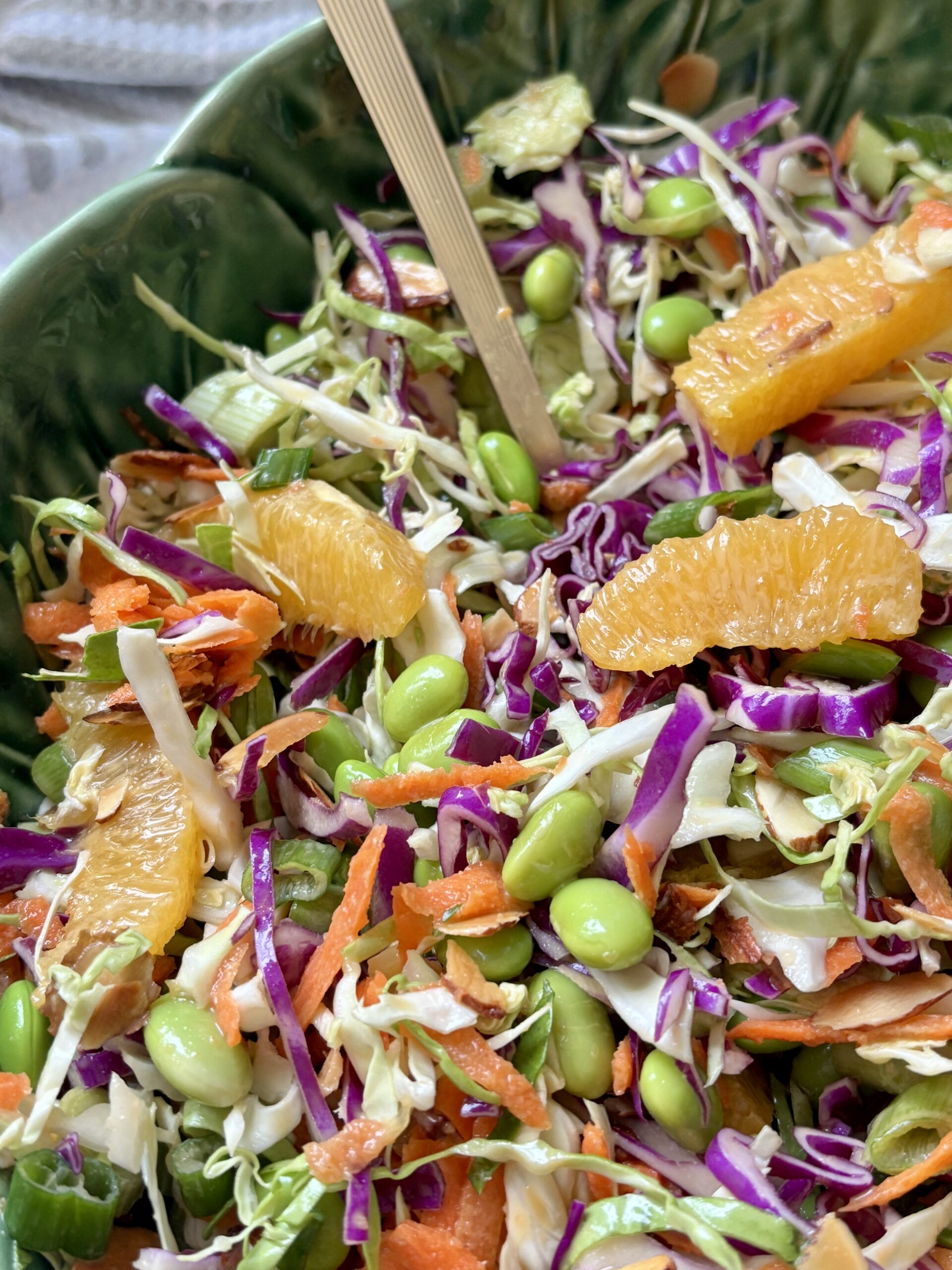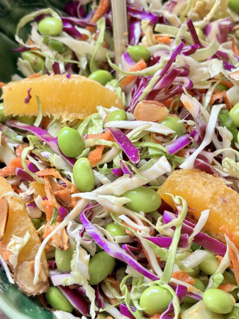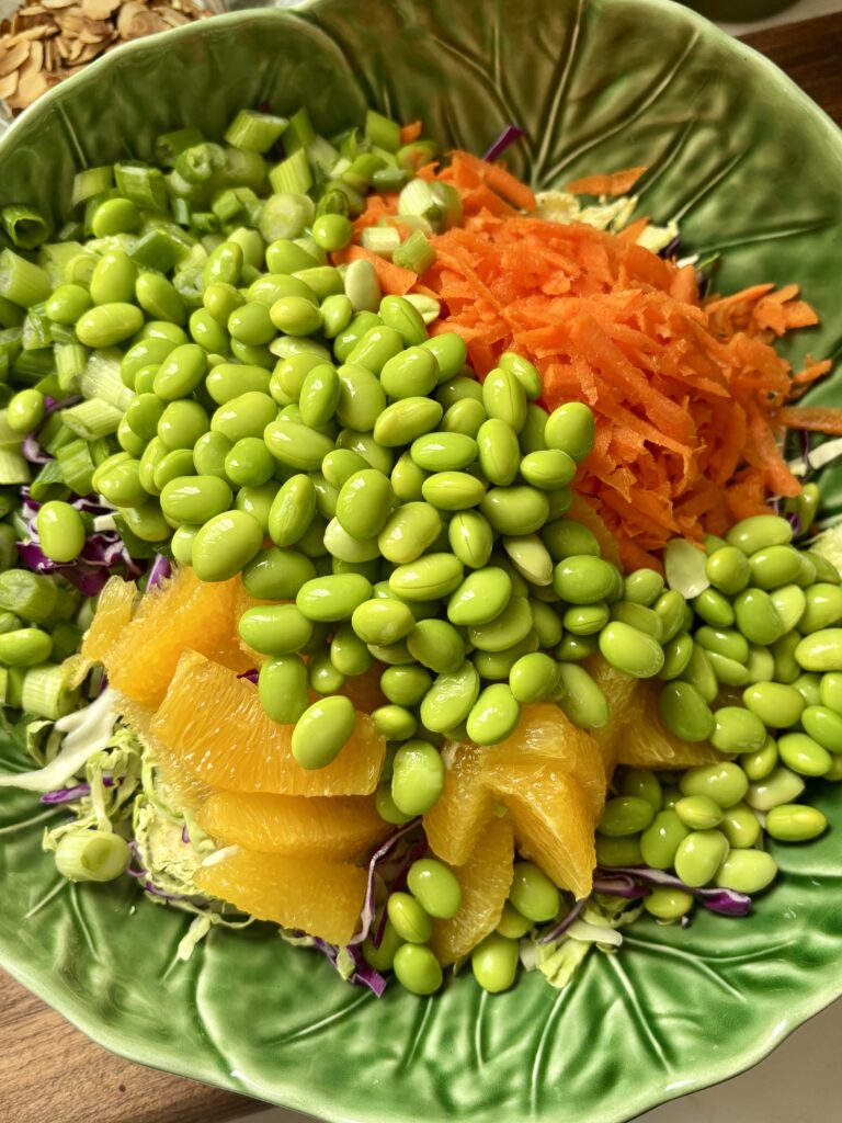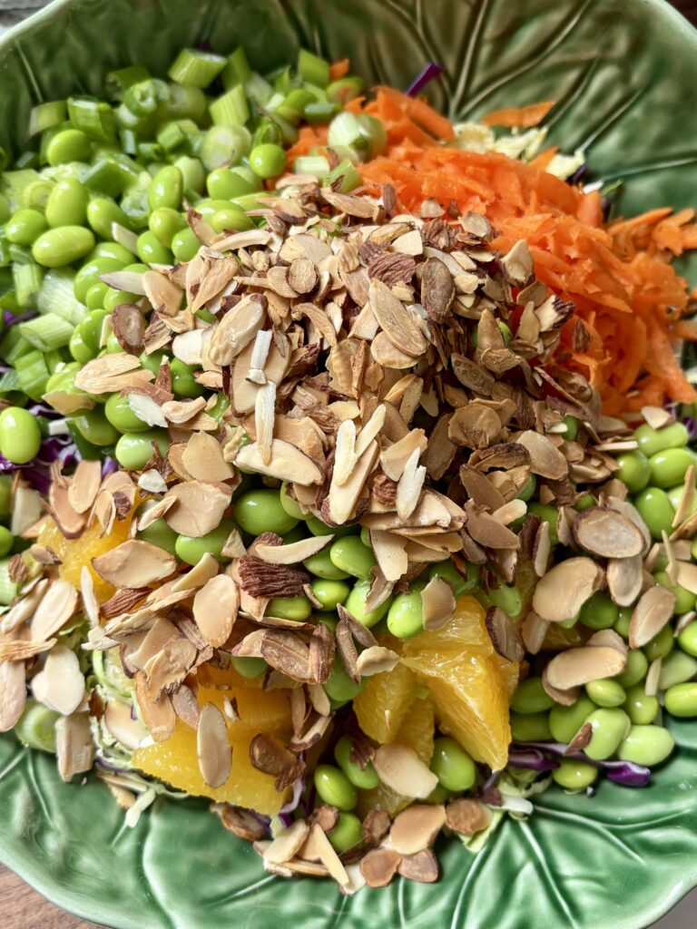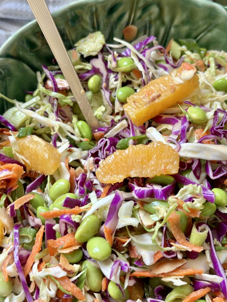 This Shaved Edamame Crunch Salad is everything you want in a fresh, spring forward salad: crisp cabbage, sweet citrus, protein packed edamame, toasted almonds, and a bright honey ginger vinaigrette that pulls it all together.