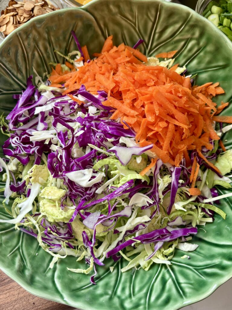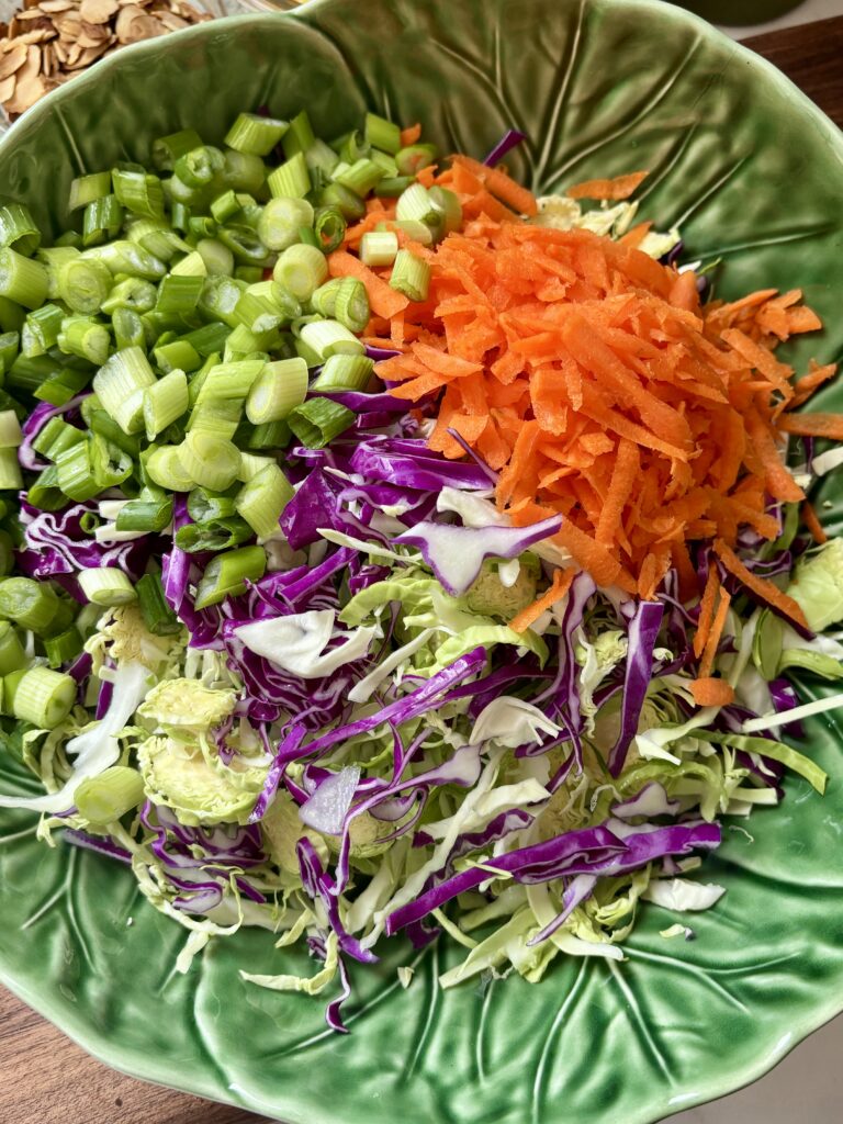 - Thinly shave cabbage, Brussels sprouts, onion, and carrots. Add to a large bowl.