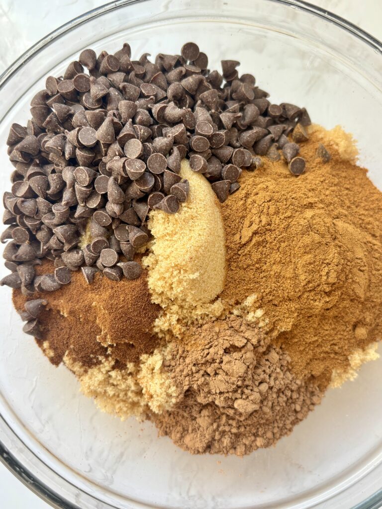 - Mix brown sugar, cinnamon, cocoa powder, chocolate chips, and espresso powder in a small bowl. Keep 6 tbsp butter ready for spreading.